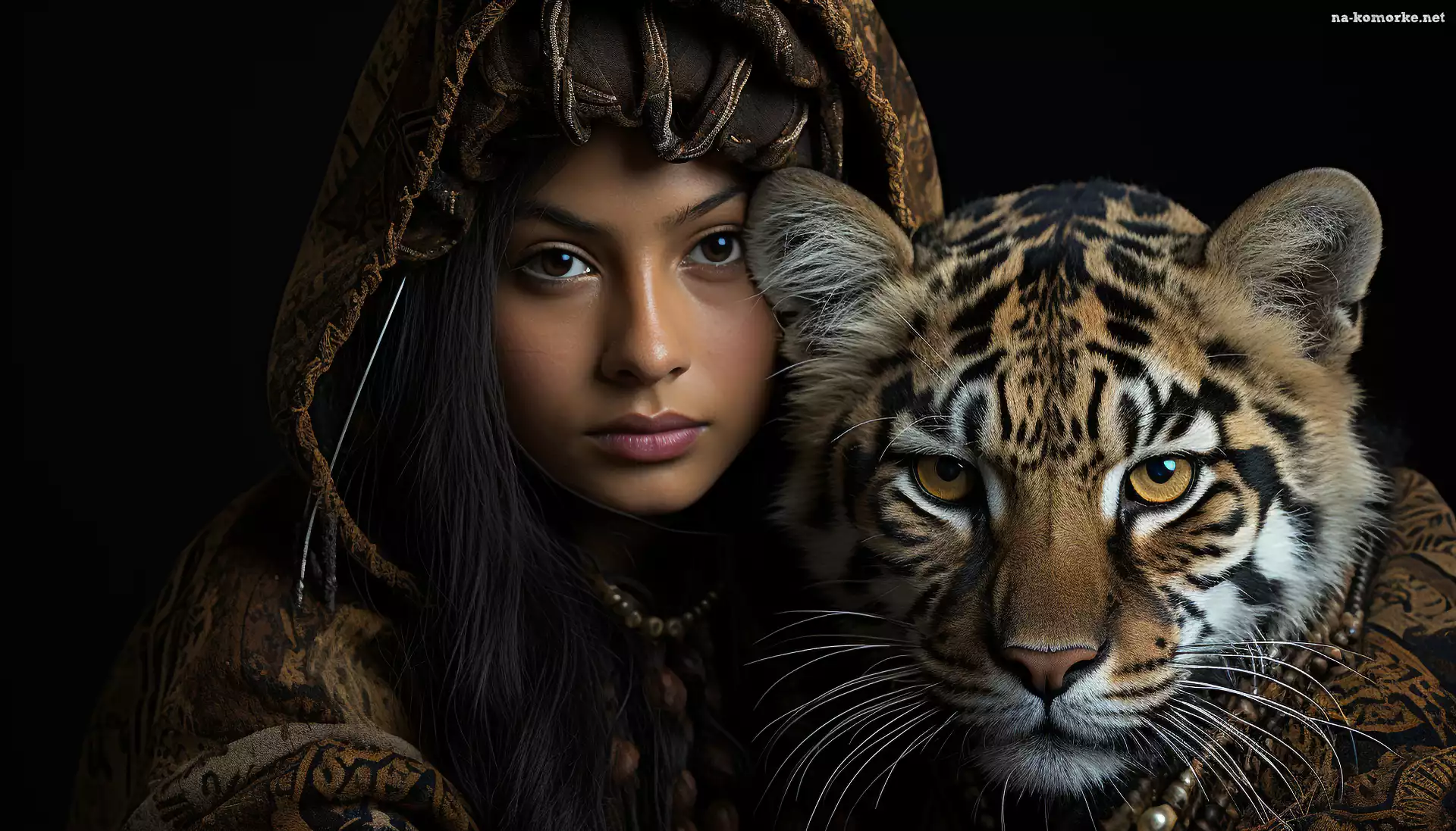 Spojrzenie, Grafika, Kobieta, Tygrys, Bizuteria, Chusta, Brunetka na Komórkę