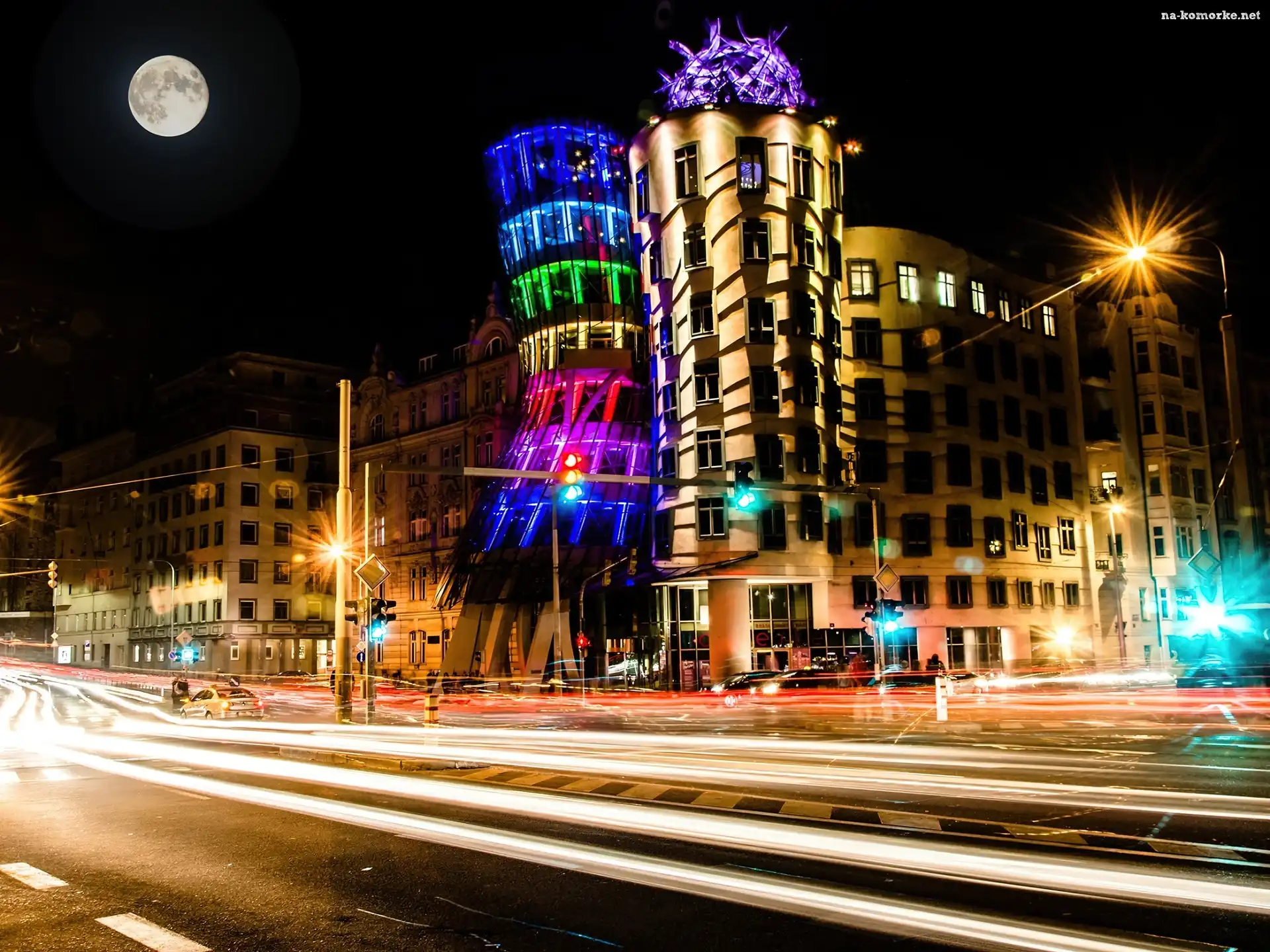 Praga, Ulica, Miasto nocą, Czechy, Oświetlone, Drapacze, Chmur na Komórkę