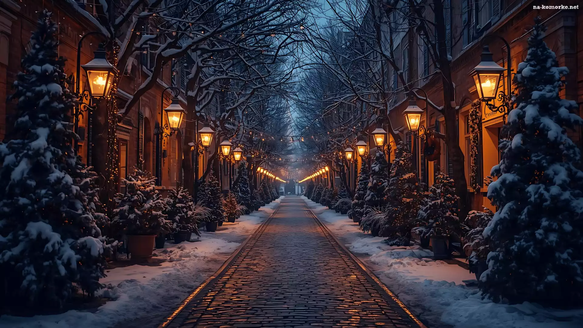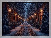 Zima, Ulica, Drzewa, Domy, Latarnie na Komórkę