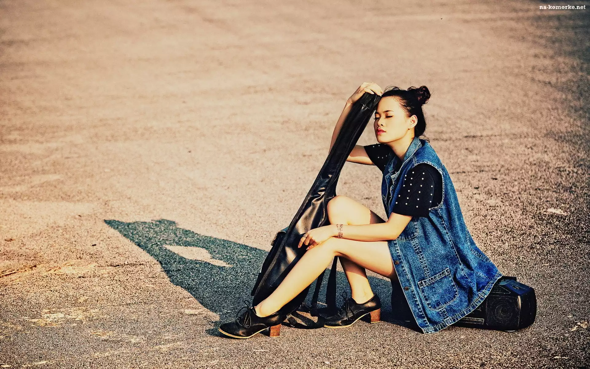 Ulica, Zamyślona, Kobieta, Gitara, Magnetofon na Komórkę