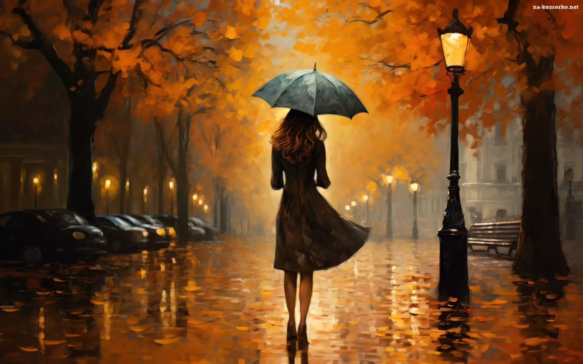 Jesień, Ulica, Wieczór, Kobieta, 2D na Komórkę
