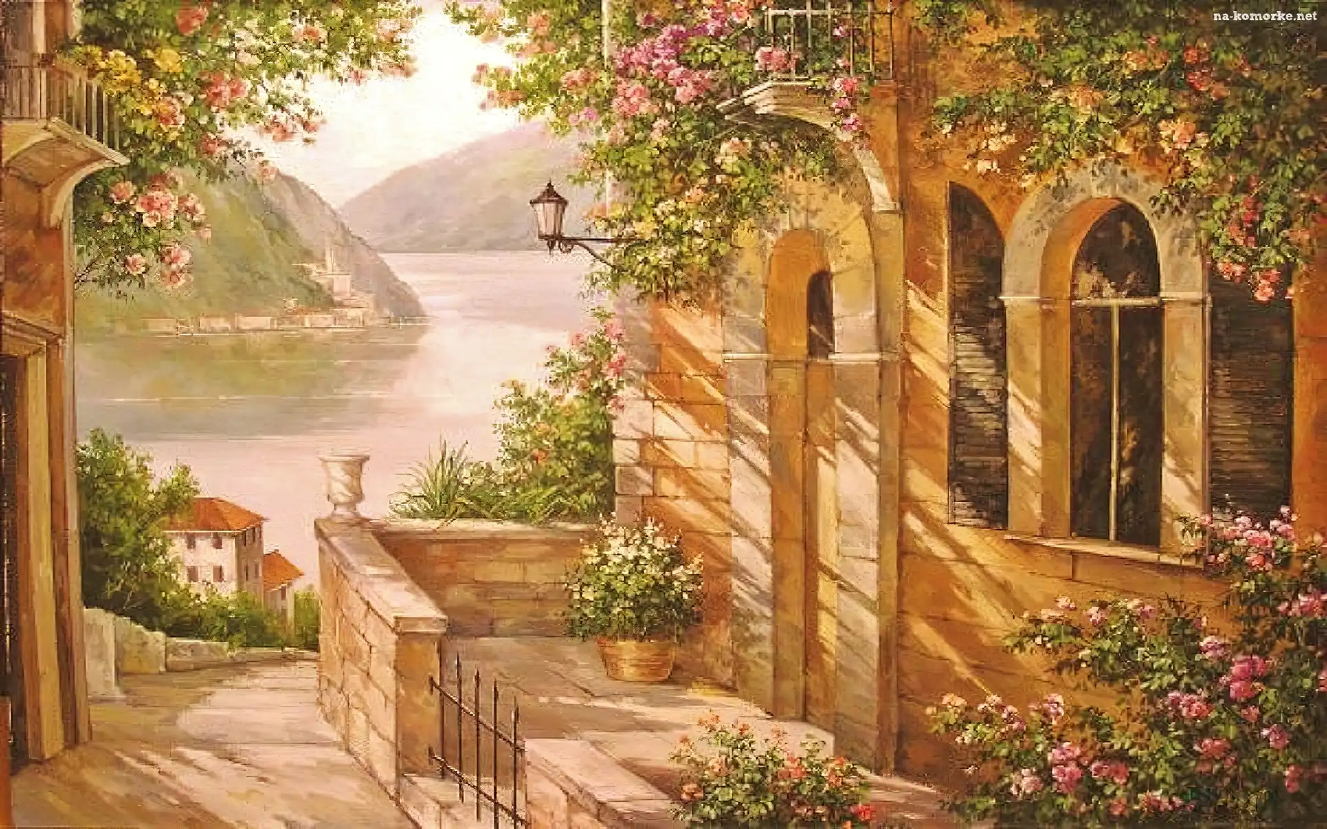 Uliczka, Morze, Dom, Kwiaty na Komórkę