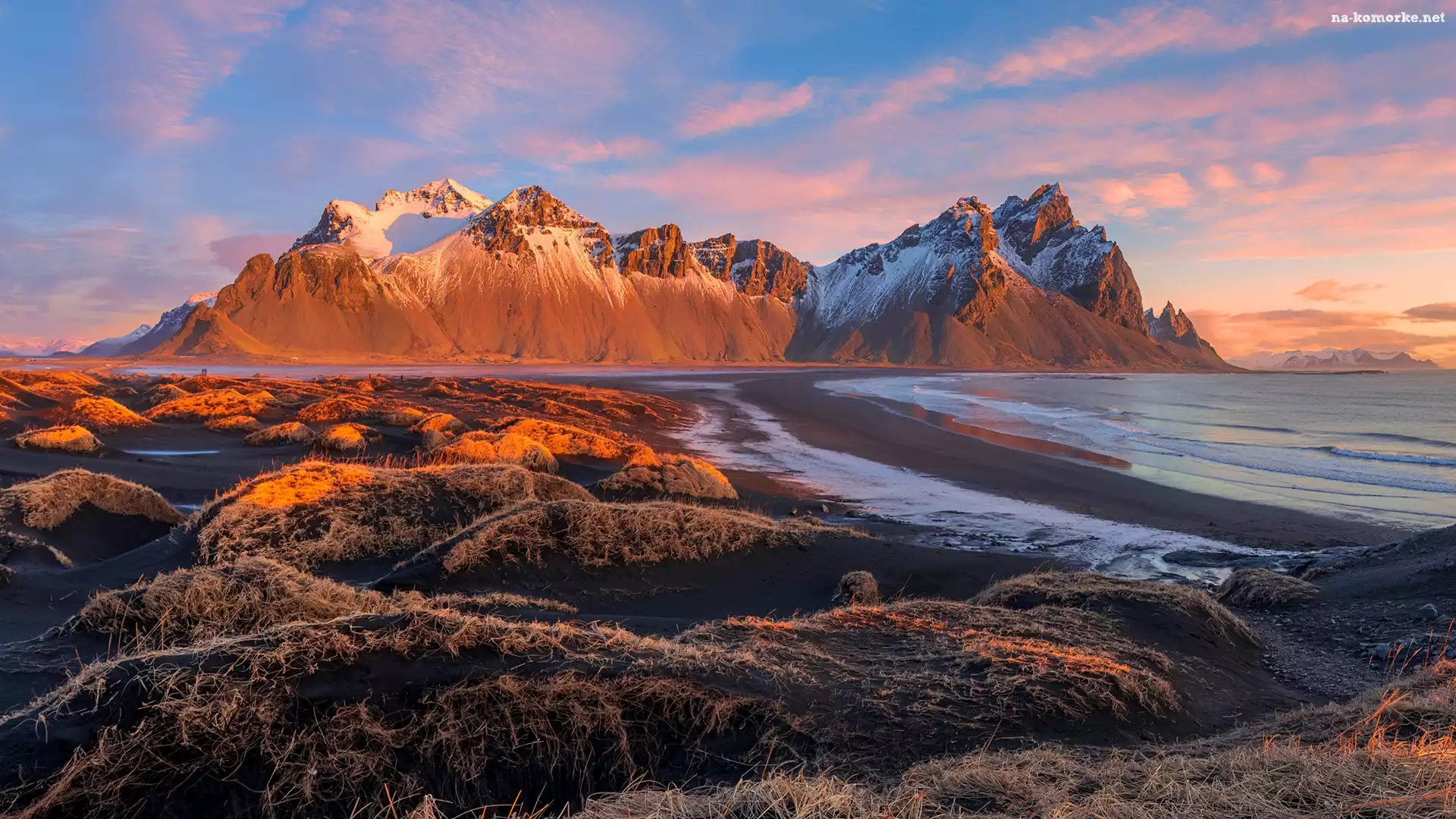 Chmury, Góry, Trawa, Islandia, Plaża Stokksnes, Góra Vestrahorn na Komórkę
