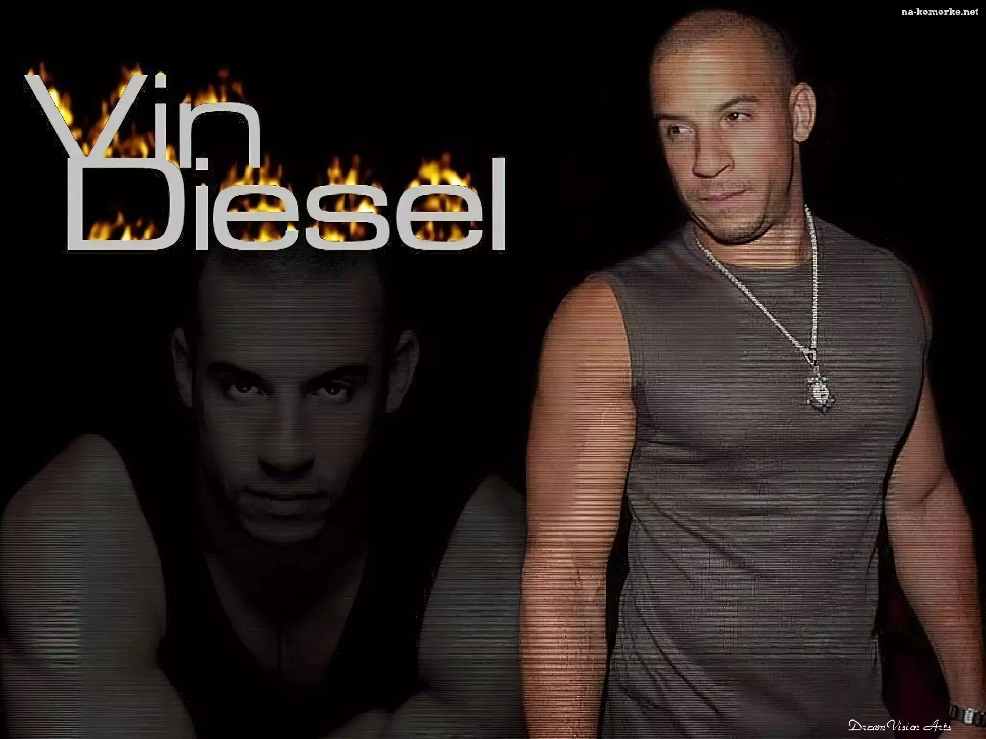 Vin Diesel, szara koszulka, łańcuszek na Komórkę