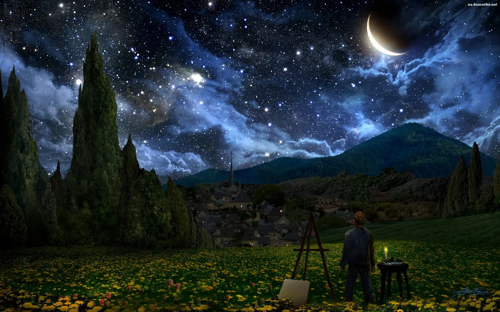 Góry, Rzeka Obłoki, Zielona, Łąka, Drzewa, Białe Wyspa, Palmy, Chmura, Morze Palmy, Plaża Czerwone, Słońce, Drzewo Brzeg, Latarnia morska, Morza, Skały Las Góry, Niebo Drzewko, Kwiaty, Wiśnia Góra, Zachód Słońca, Jezioro Góry, Zima, choinki Drzewo, Zachód Słońca Dziewczyna, Księżyc, Mostek, Noc Chmury, Księżyc