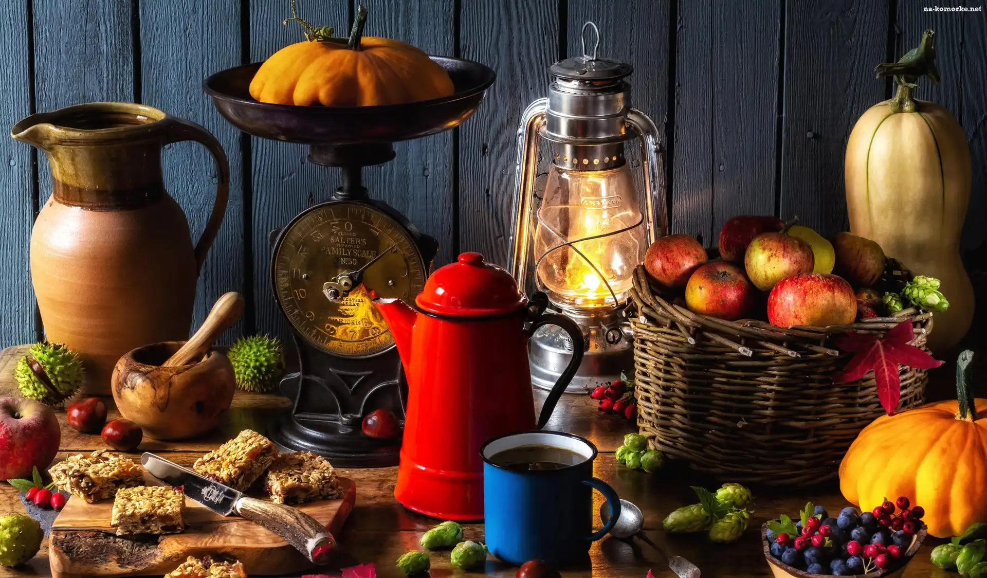 Kompozycja, Kosz, Kubek, Czerwony, cistka, Waga, Lampa naftowa, Dzbanek, Nóż, Jabłka, Dynie na Komórkę |