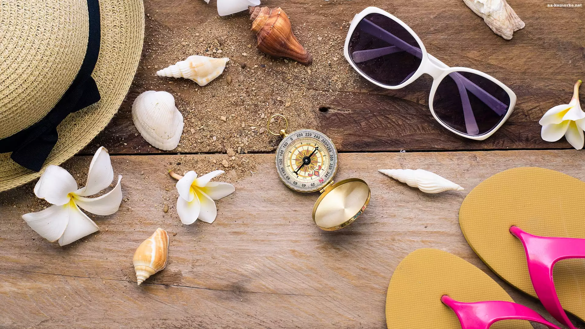 Muszelki, Kapelusz, Kompas, Klapki, Kompozycja, Okulary, Deski, Plumeria, Wakacje na Komórkę