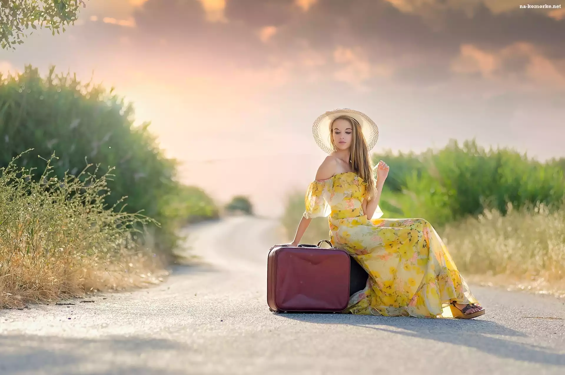 Walizka, Kobieta, Droga, Kapelusz, Sukienka na Komórkę