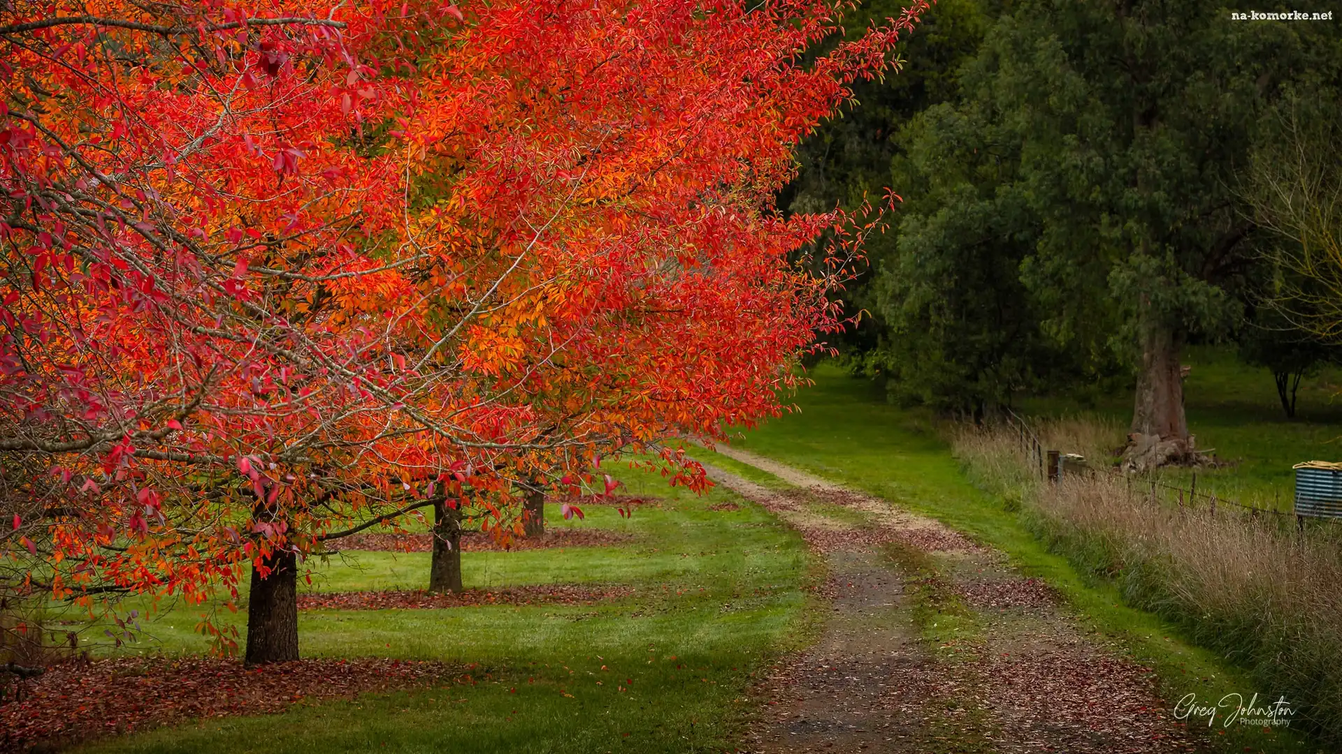 Drzewa, Park, Liście, Jesień, Australia, Droga, Stan Wiktoria, Czerwone, Wandiligong na Komórkę