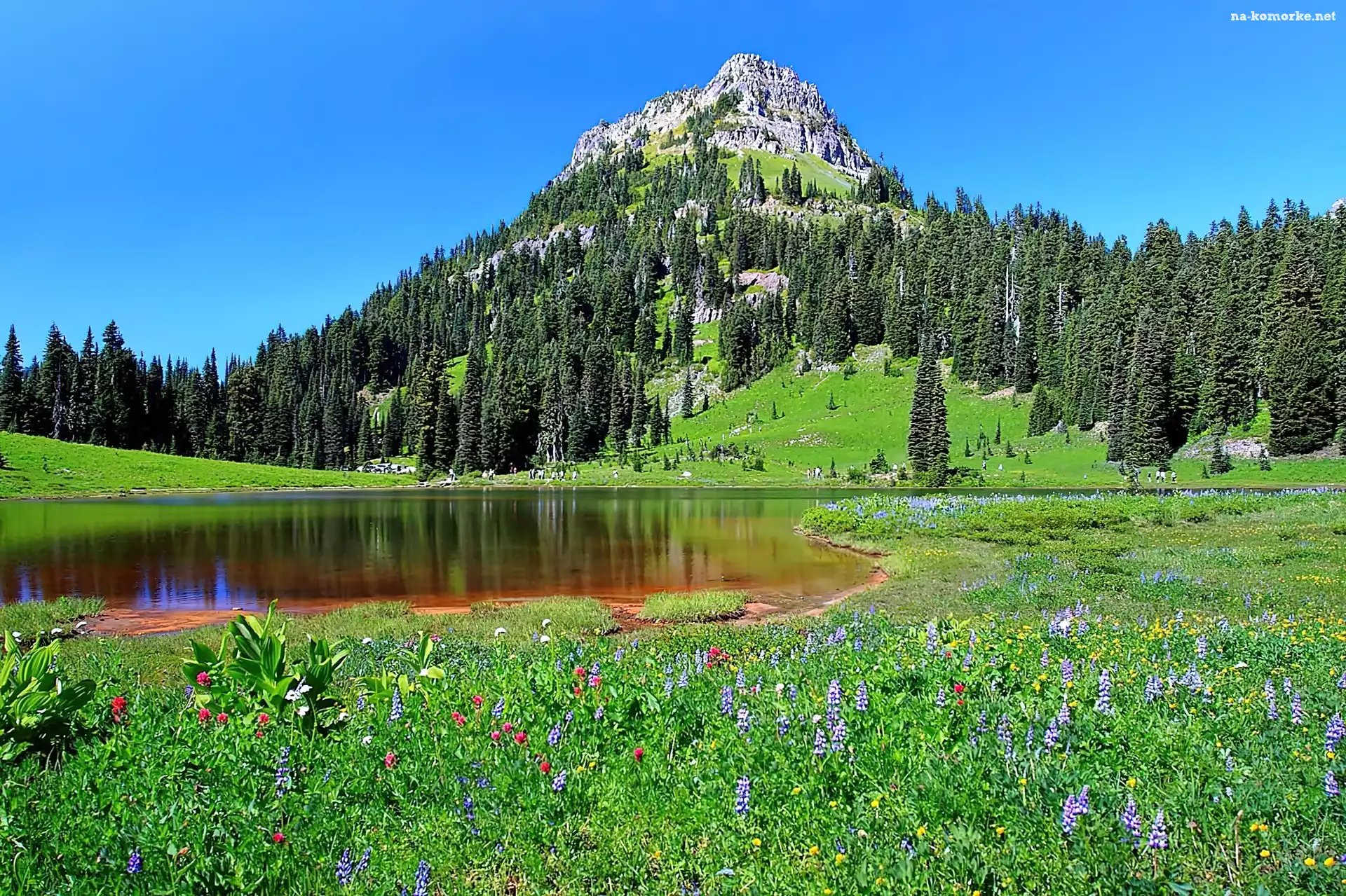 Łąka, Stany Zjednoczone, Stan Waszyngton, Park Narodowy Mount Rainier, Jezioro Tipsoo na Komórkę