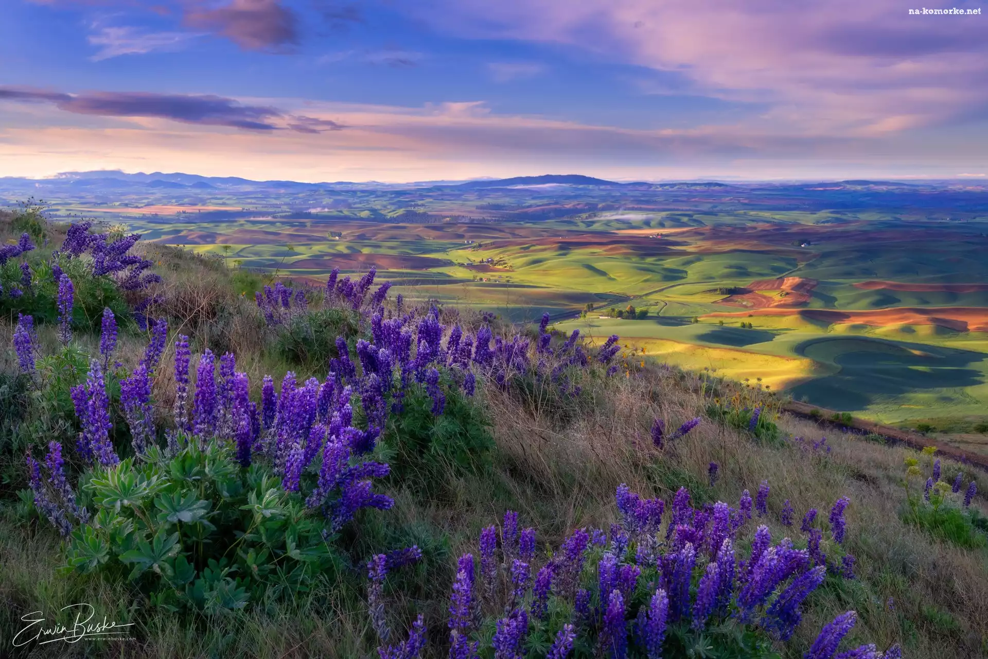 Wzgórza, Kwiaty, Stany Zjednoczone, Park stanowy Steptoe Butte, Łąki, Dolina, Łubin, Palouse, Pola, Trawa, Wschód słońca, Waszyngton na Komórkę |
