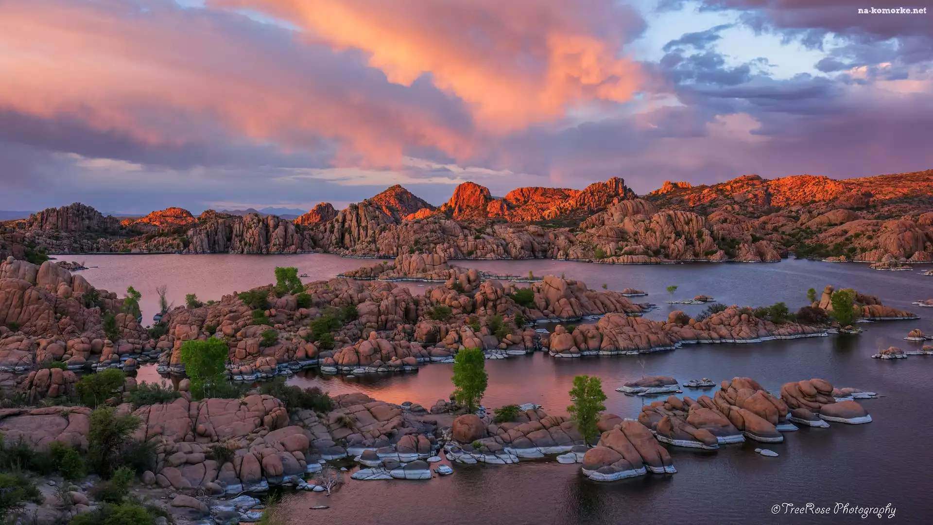 Watson Lake, Drzewa, Stany Zjednoczone, Chmury, Skały, Jezioro, Arizona na Komórkę
