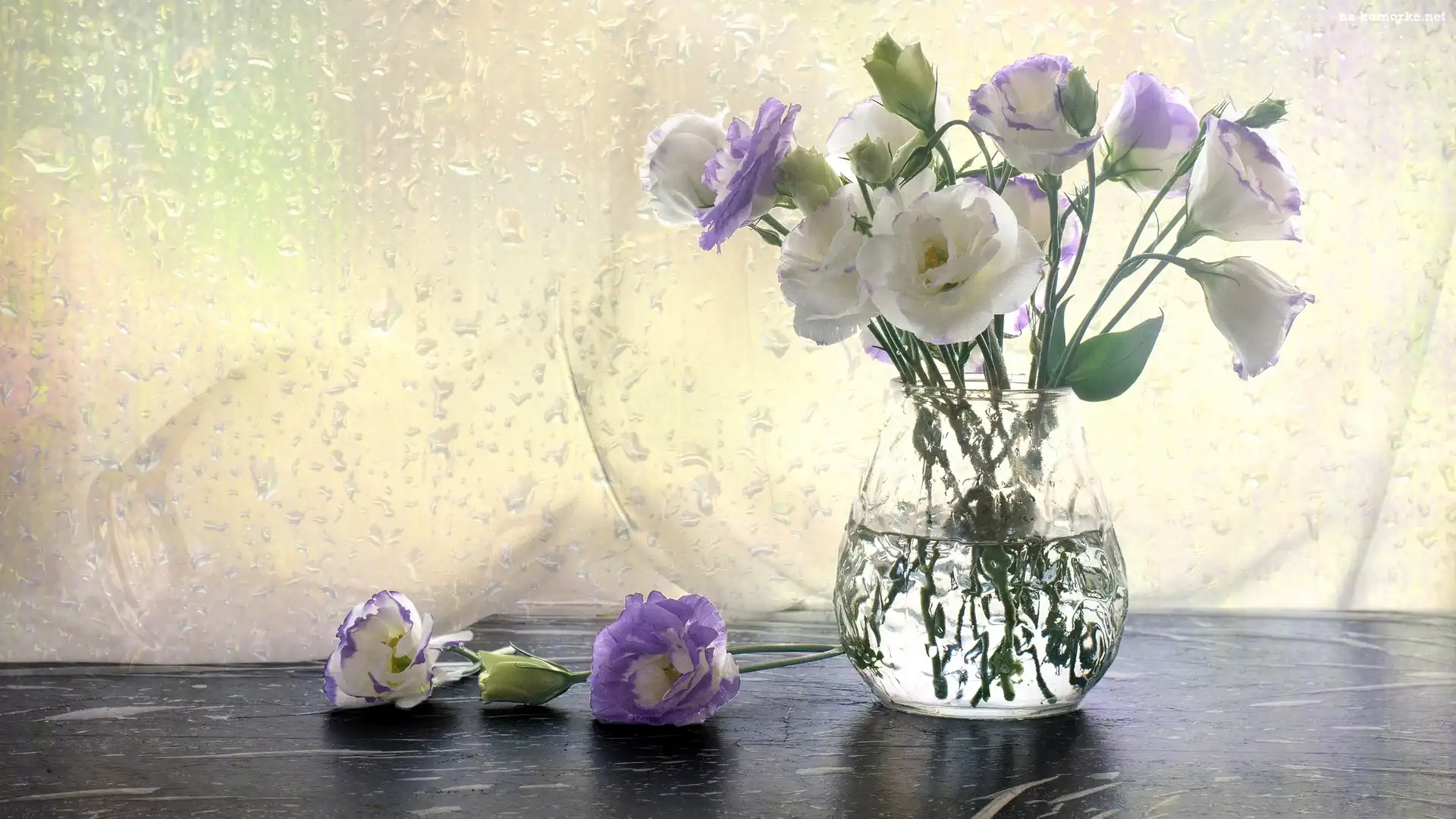 Wazon, Biało-fioletowe, Kwiaty, Eustomy, Szklany na Komórkę