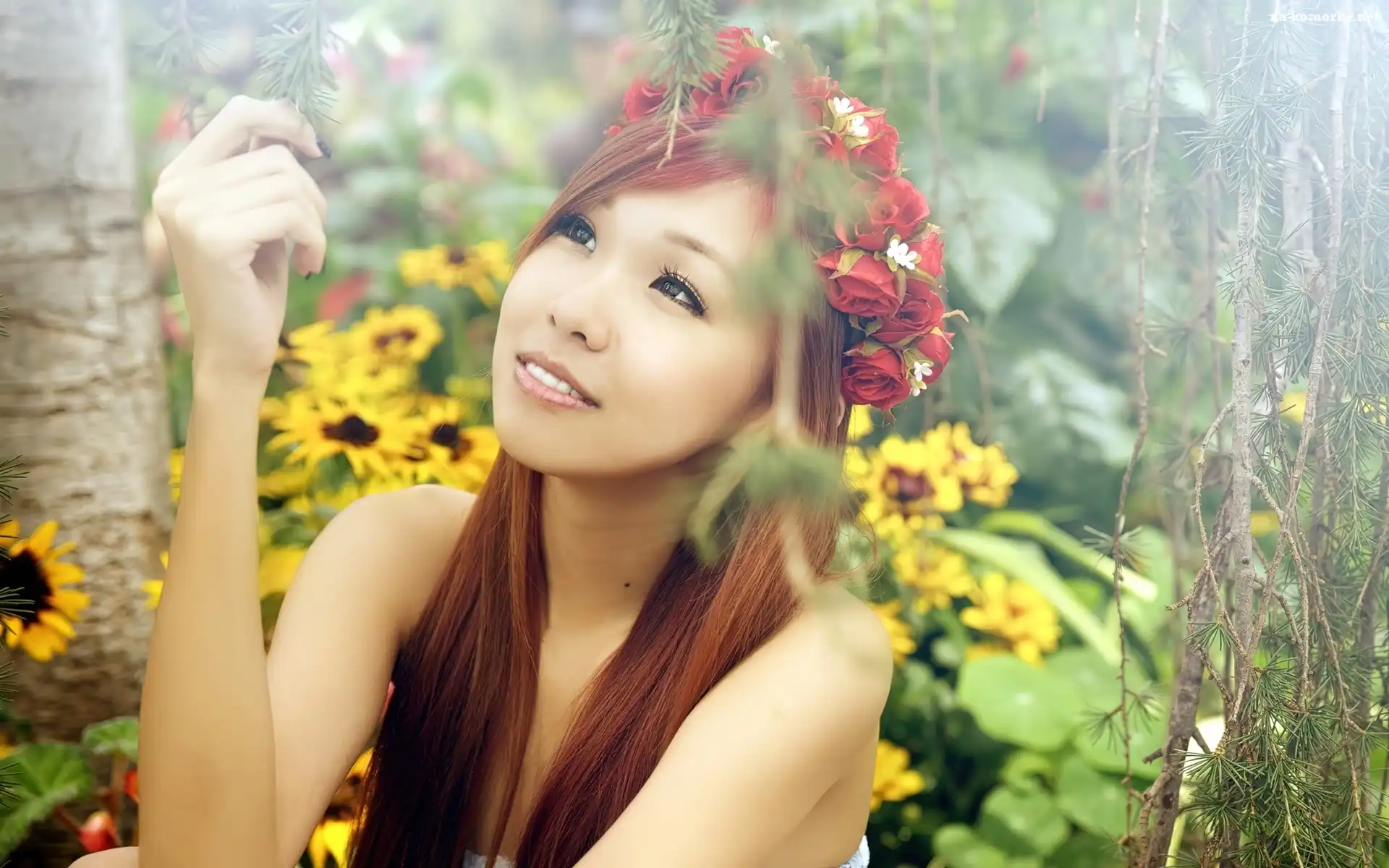 Wianek, Kobieta, Kwiaty, Słoneczniki, Róże na Komórkę