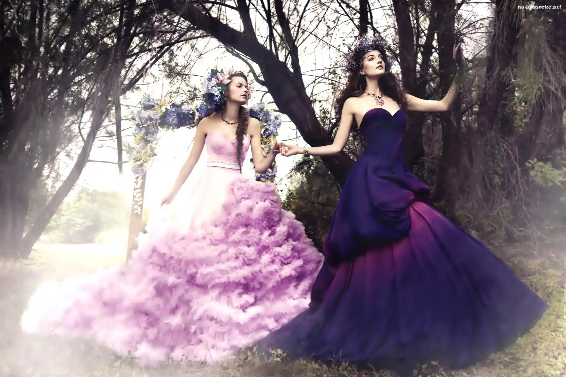 Wianki, Las, Dwie, Kobiety, Suknie na Komórkę