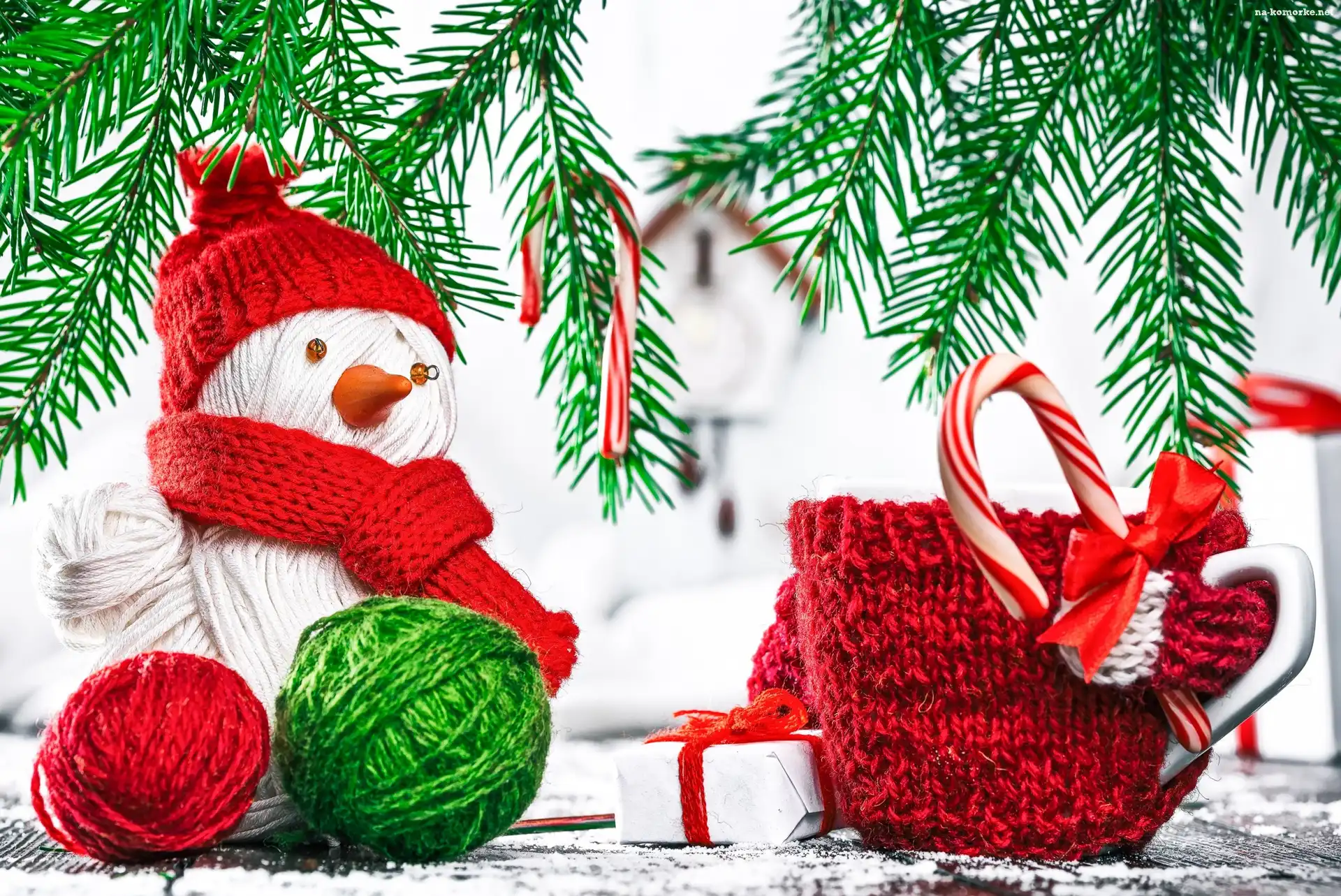 Bałwanek, Świąteczna, Włóczka, Dekoracja, Kubek, Prezent, Lizaki, Gałązki na Komórkę