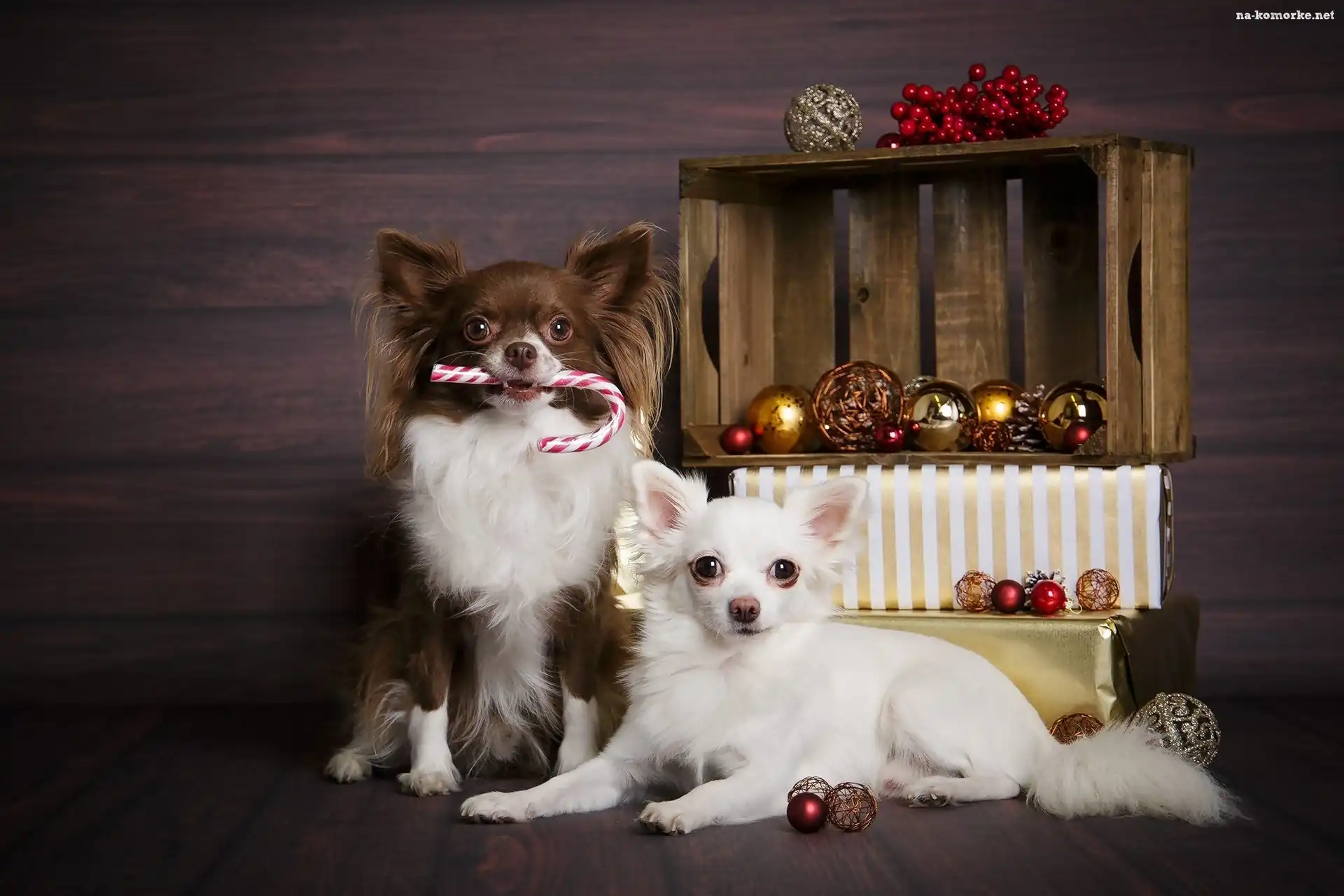 Świąteczne, Dwa, Psy, Chihuahua długowłosa, Bombki na Komórkę