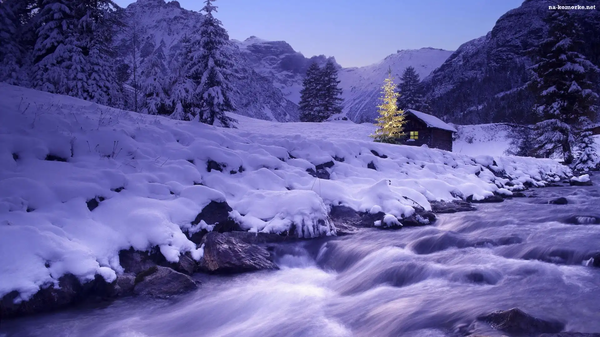 Las, Światełka, Śnieg, Rzeka, Góry, Domek, Choinka na Komórkę