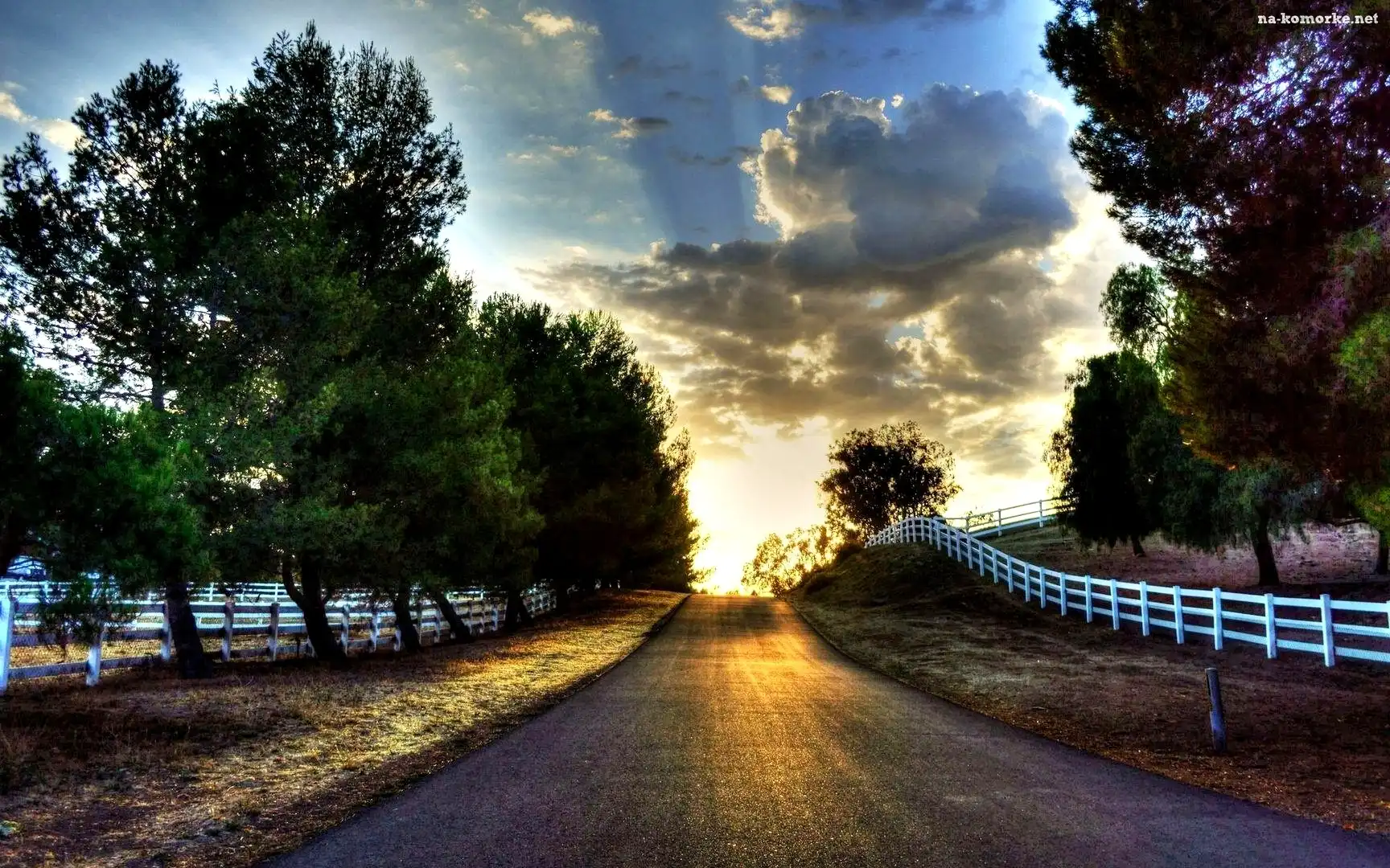Światło, Chmury, Droga, Drzewa, Przebijające, Ogrodzenie na Komórkę