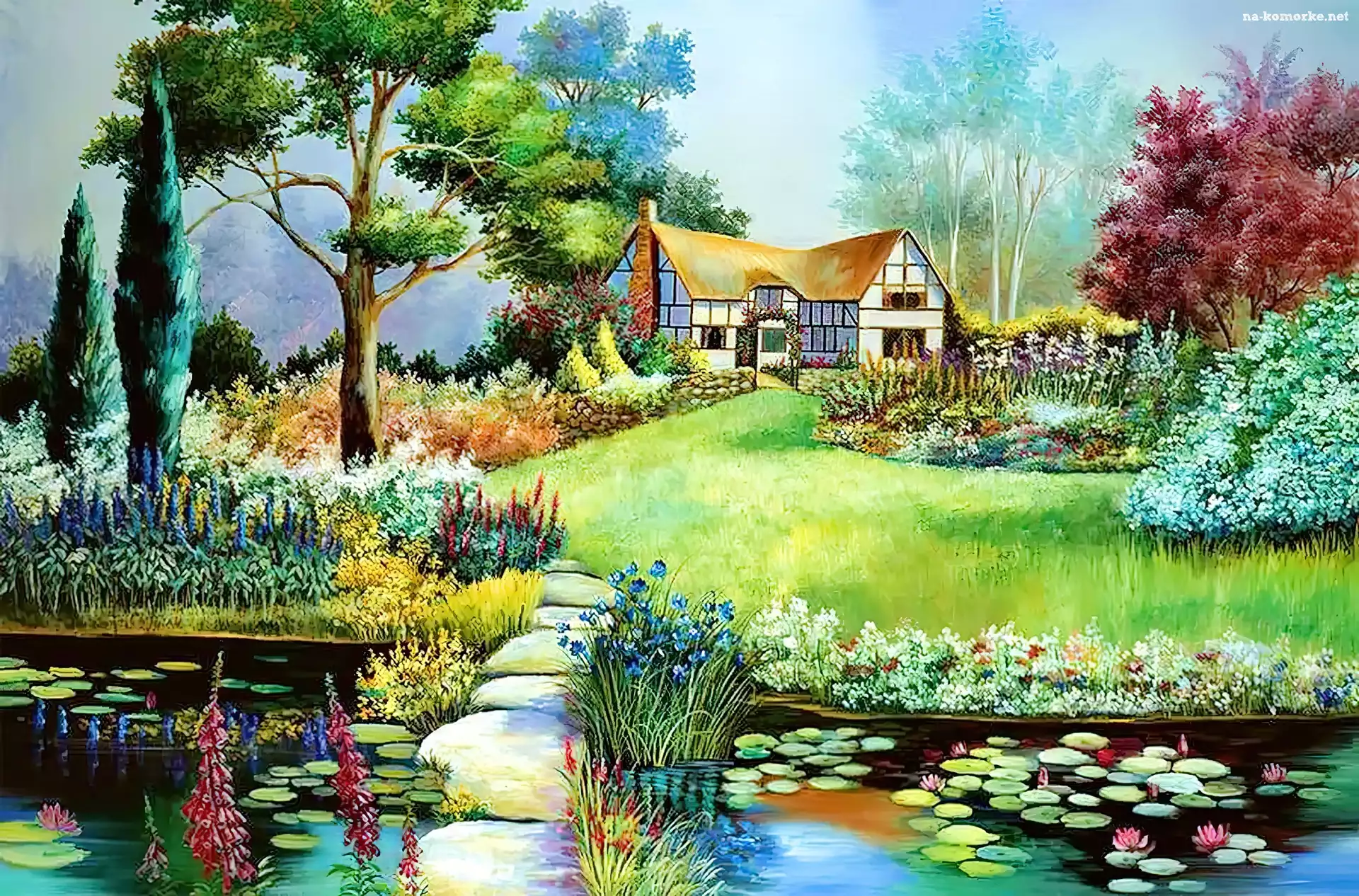 Widoczek, Dom, Rzeka, Kładka, Kwiaty na Komórkę