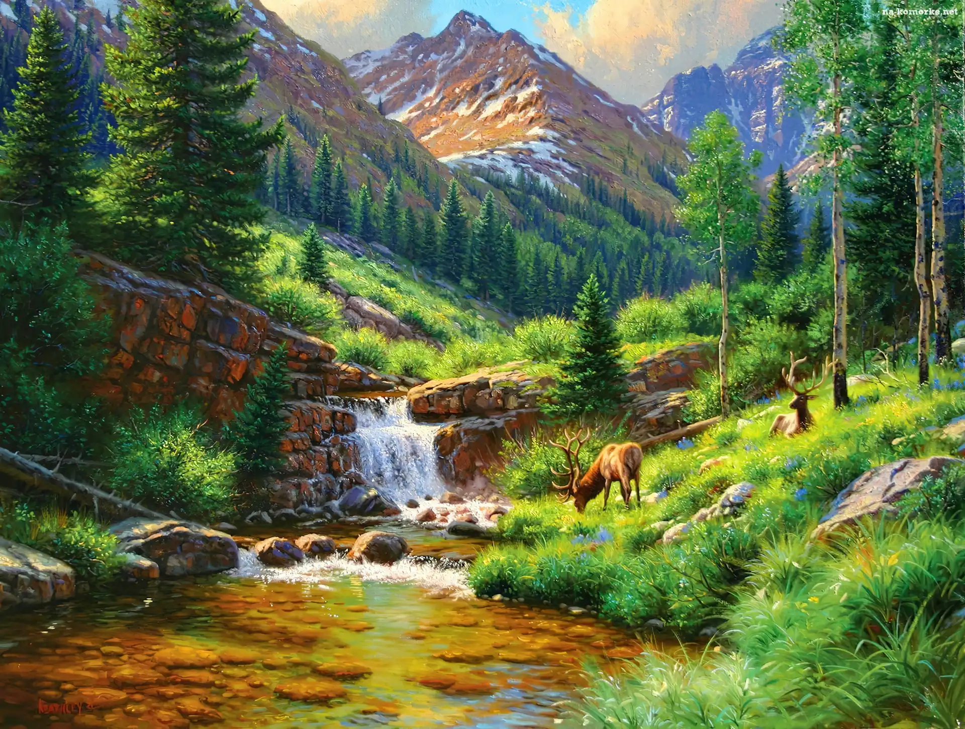 Widoczek, Rzeka, Góry, Las, Jelenie na Komórkę