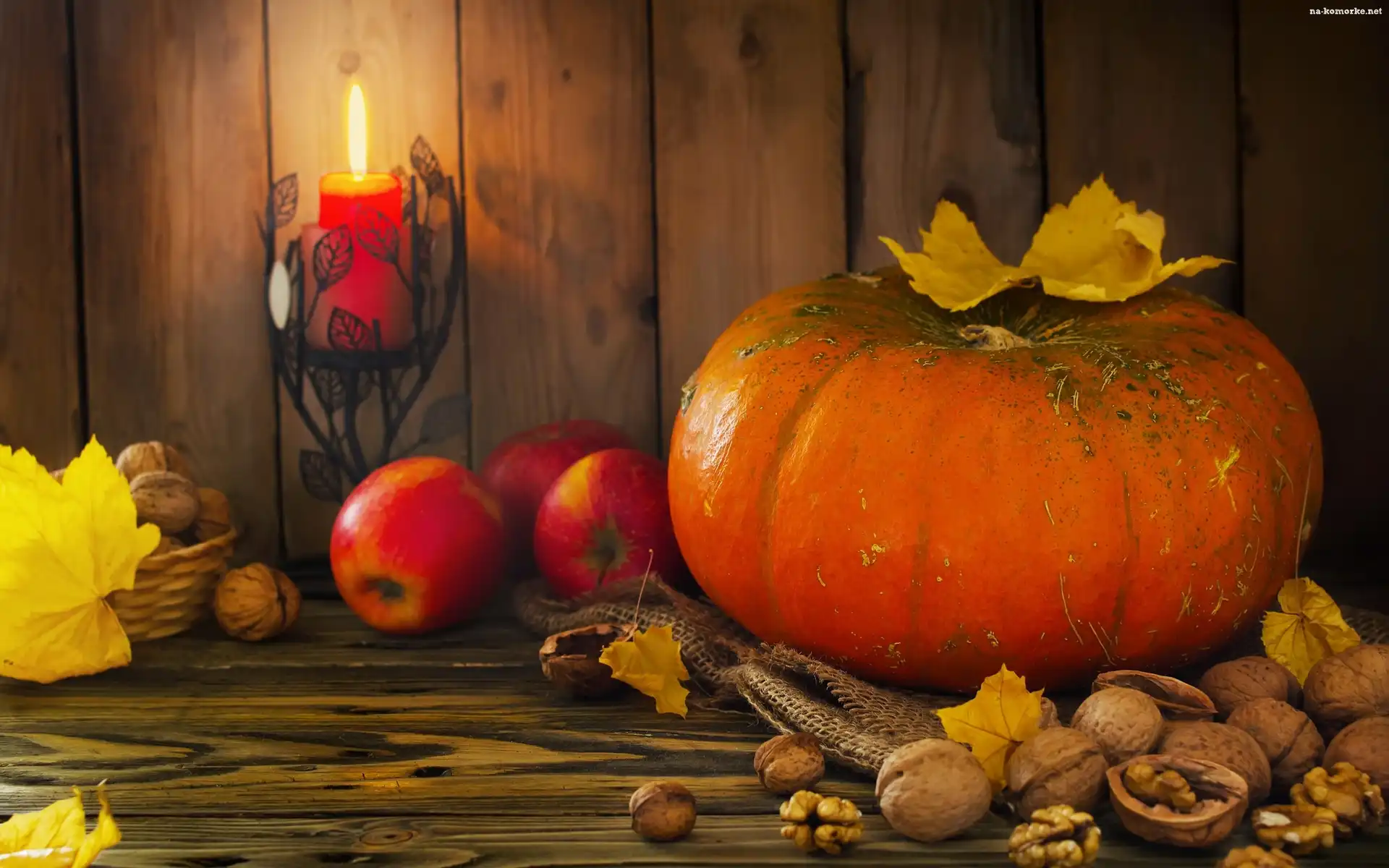 Świeczka, Liście, Kompozycja, Orzechy, Dynia, Jabłka na Komórkę