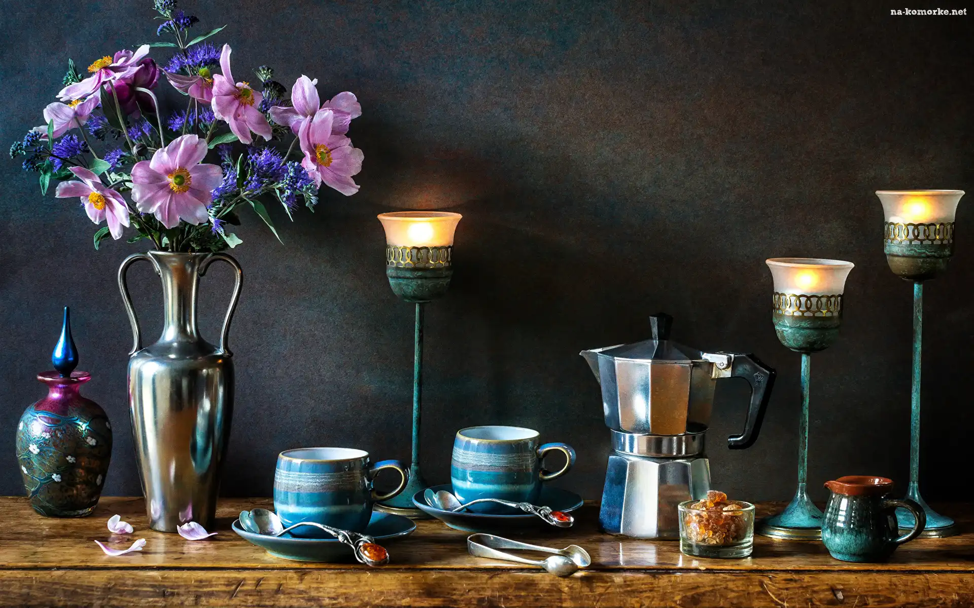 Bukiet, Świeczniki, Kompozycja, Kwiaty, Zawilce, Filiżanki, Kawiarka na Komórkę
