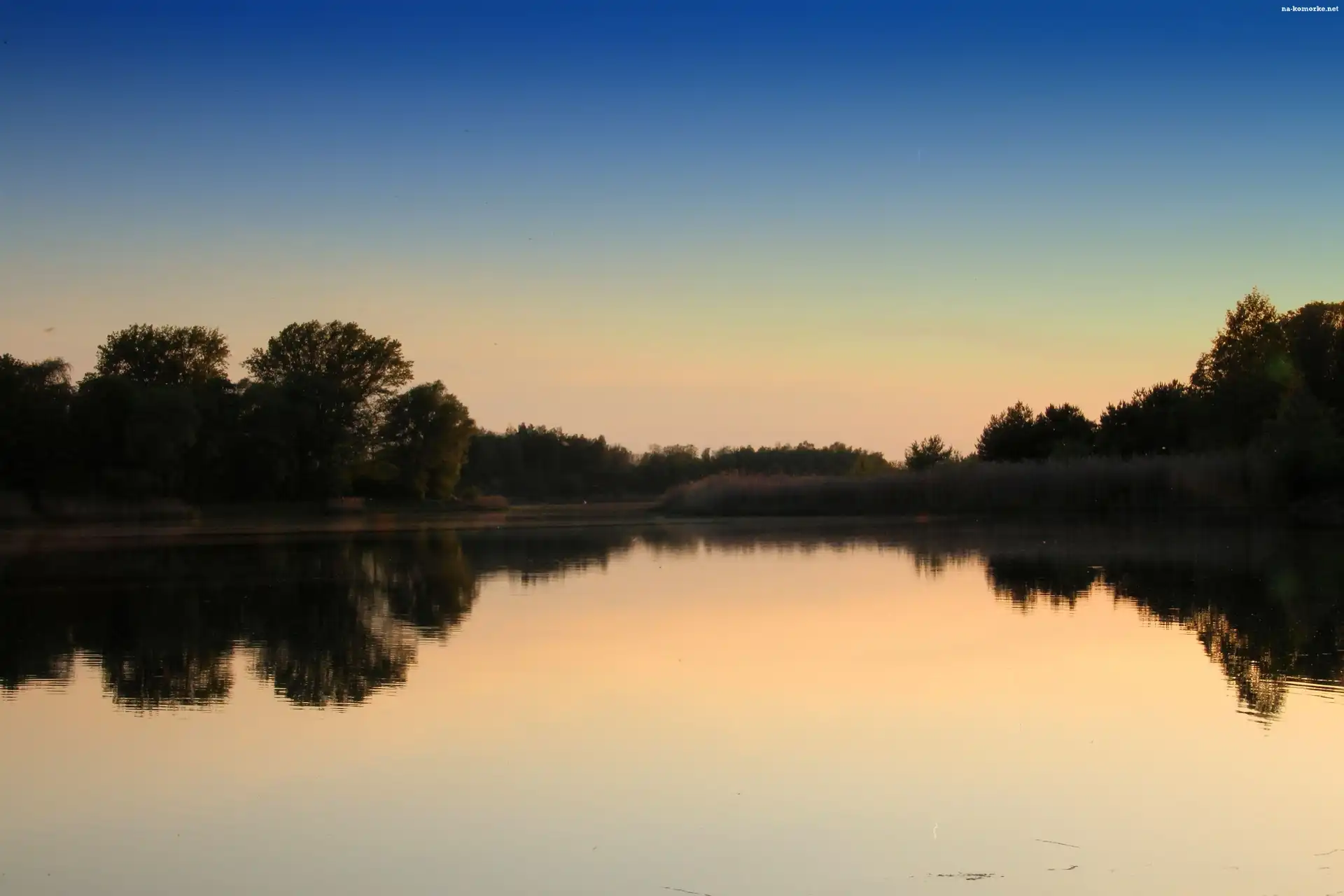 Wieczór, Zarośla, Jezioro, Drzewa na Komórkę