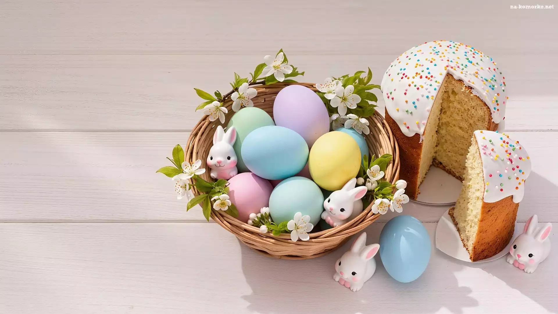 Zajączki, Jajka, Wiklinowy, Koszyk, Babka, Kolorowe, Wielkanoc, Porcelanowe, Białe, Kwiaty, Ciasto na Komórkę |