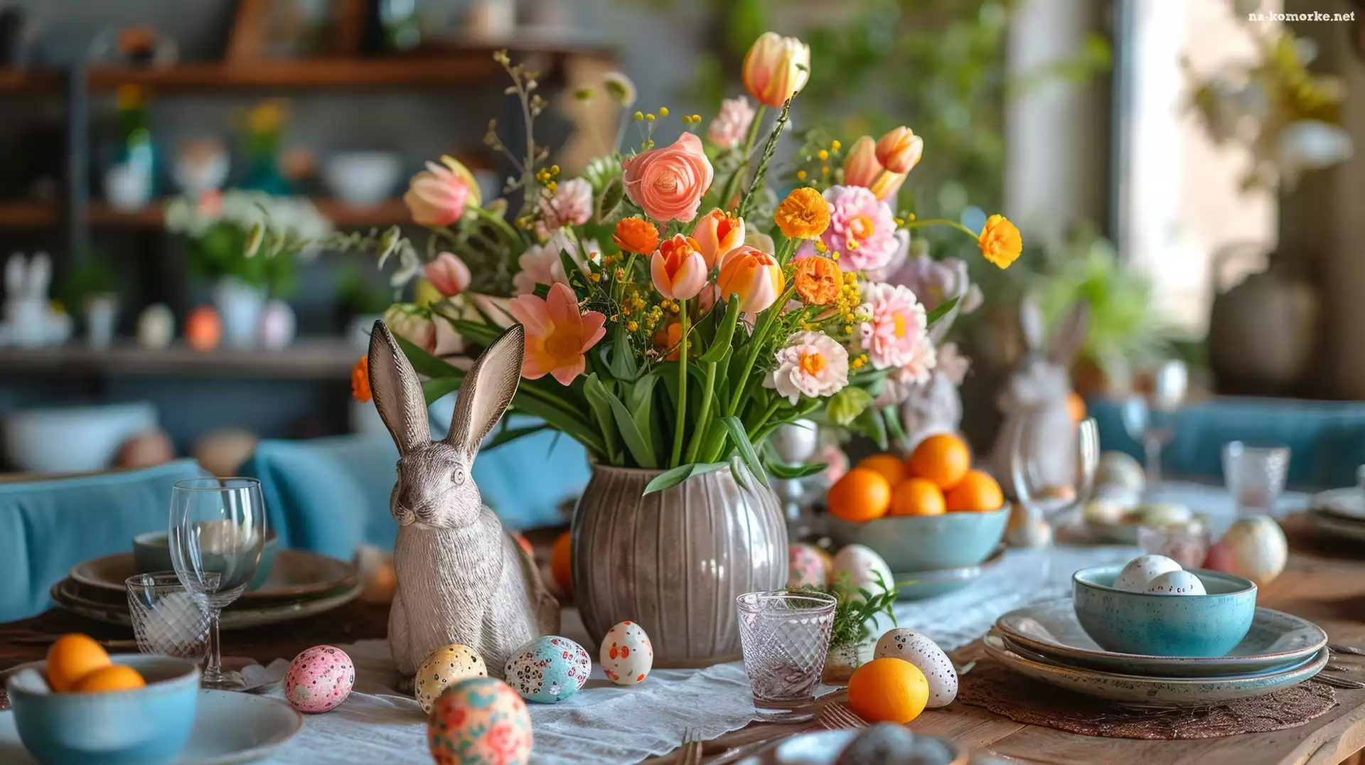 Kolorowe, Bukiet, Zając, Stół, Kwiaty, Grafika, Pisanki, Wielkanoc na Komórkę