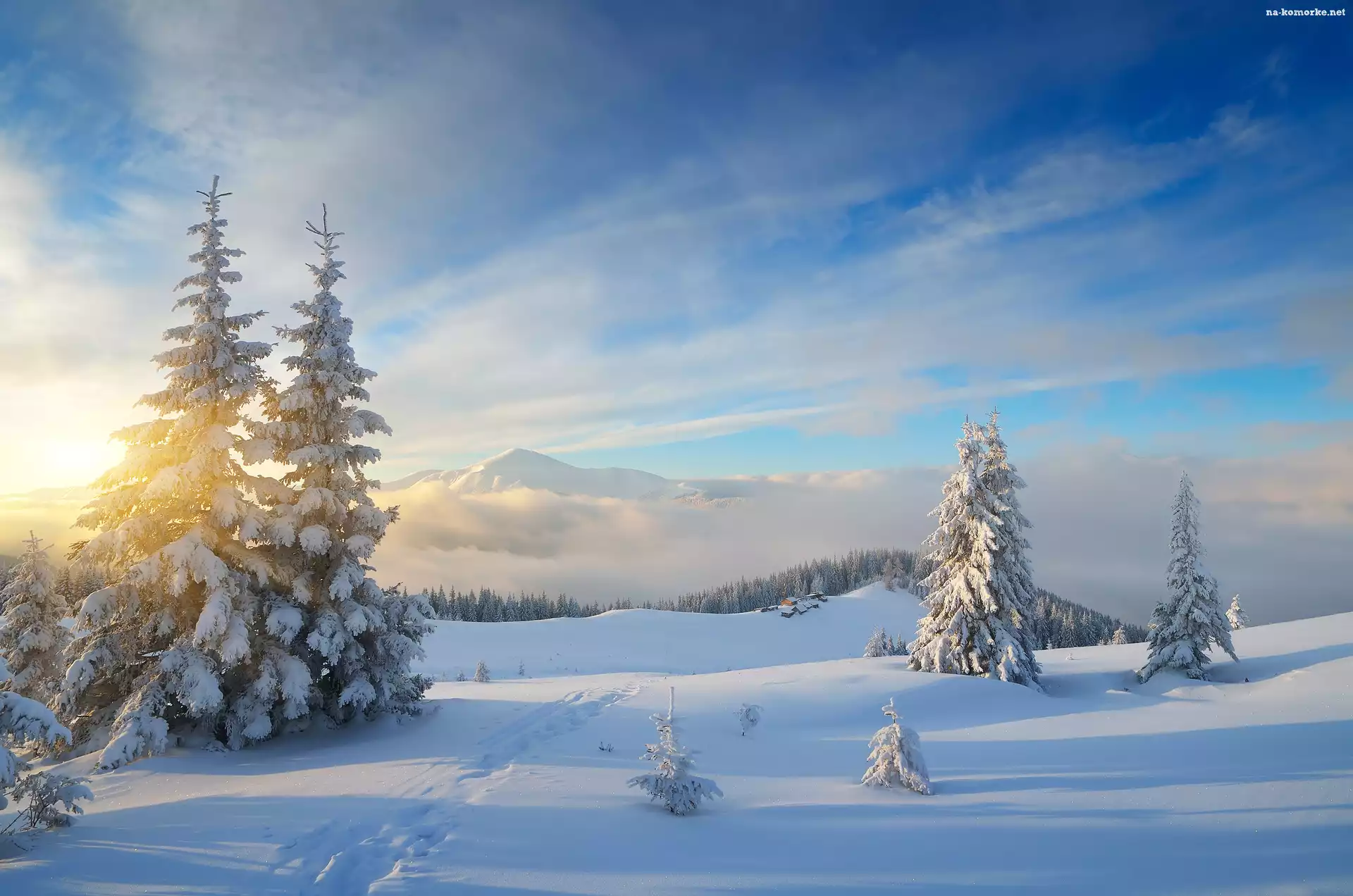 Świerki, Góry, Wschód słońca, Chmury, Ośnieżone na Komórkę