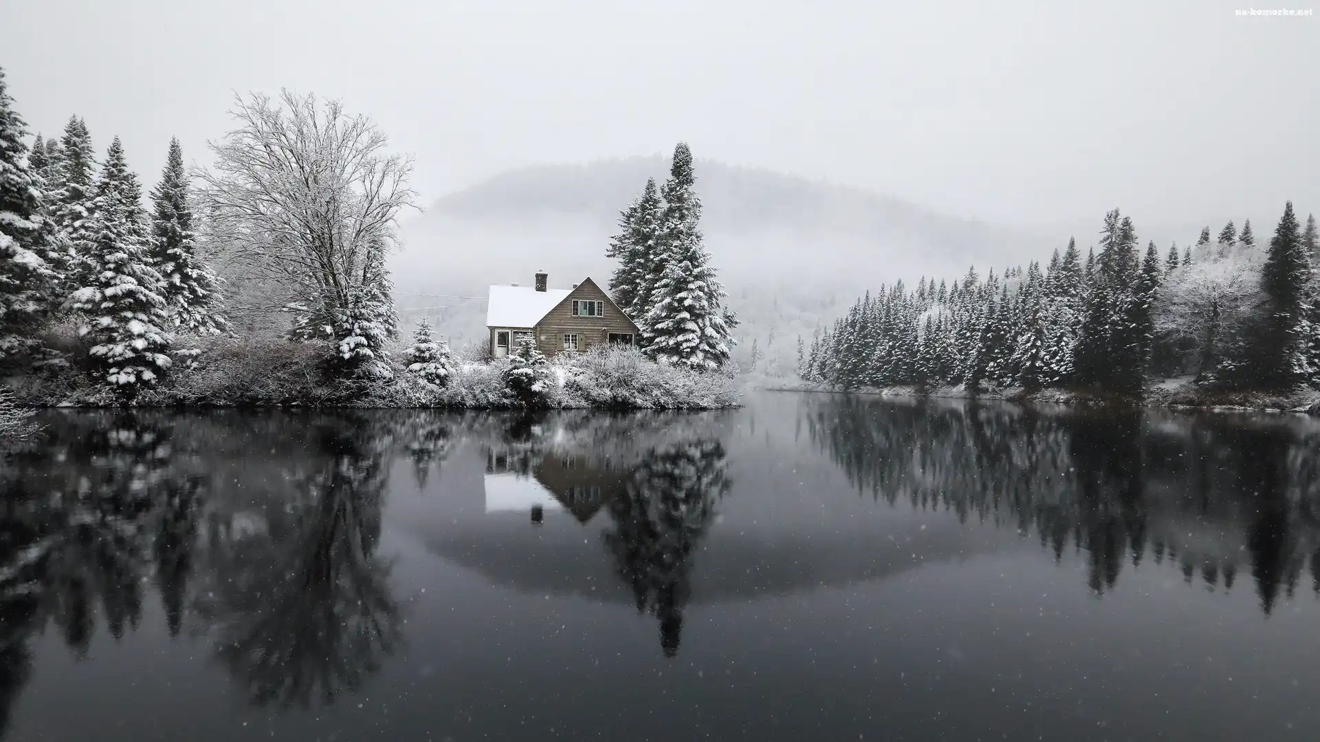 Jezioro, Świerki, Odbicie, Dom, Zima, Śnieg, Drzewa na Komórkę