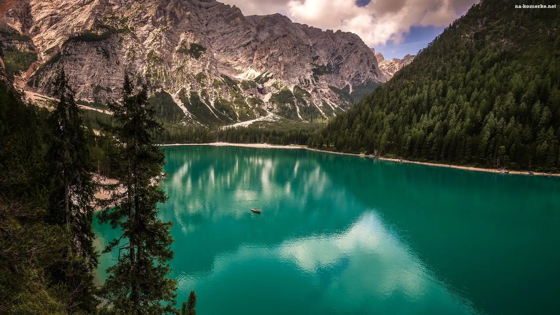 Jezioro Pragser Wildsee, Góry, Świerki, Lago di Braies, Włochy, Dolomity, Południowy Tyrol, Drzewa, Łódka na Komórkę |