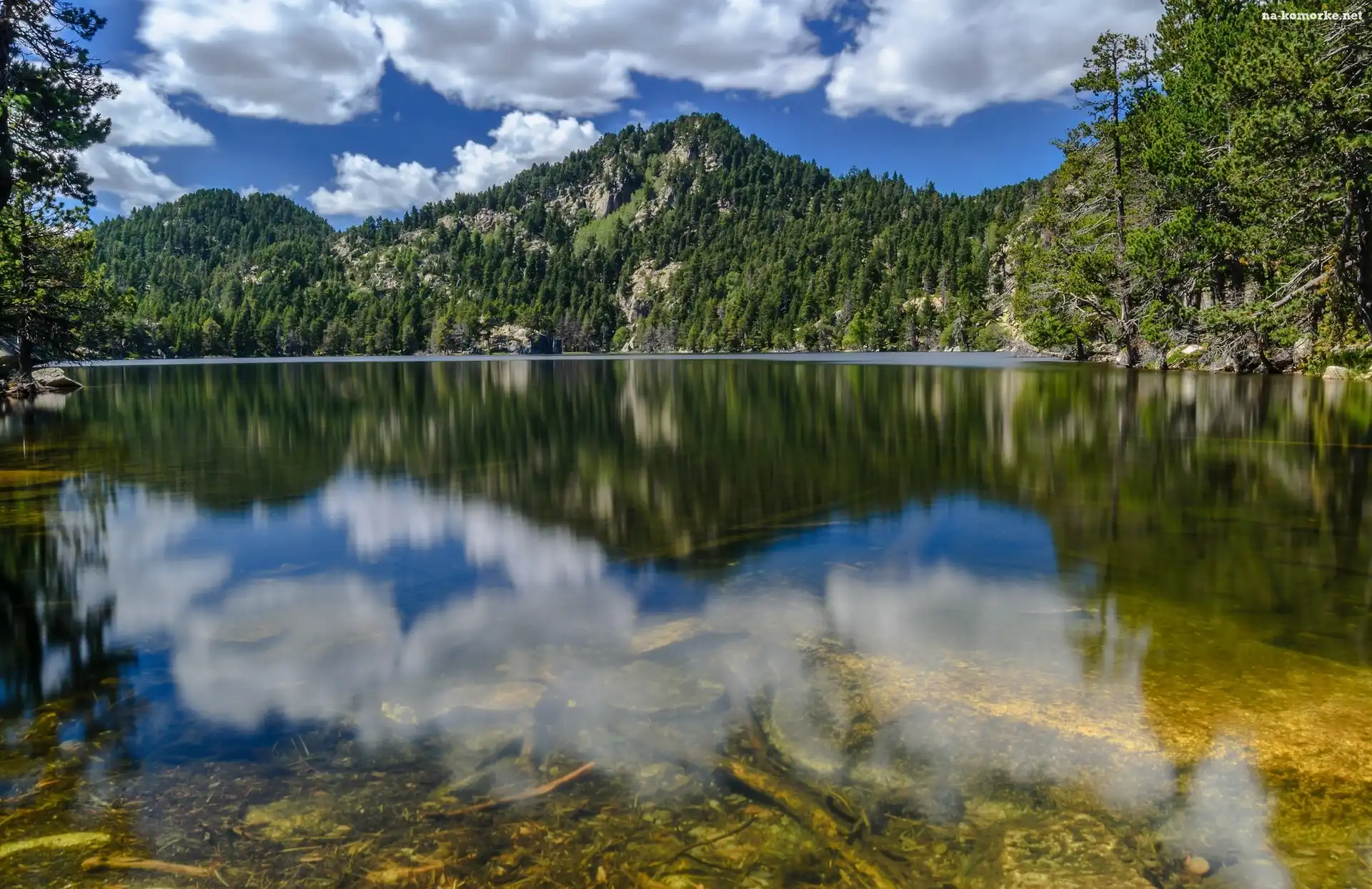 Jezioro, Góry Pireneje, Francja, Odbicie, Masyw Massif del Carlit, Świerki na Komórkę