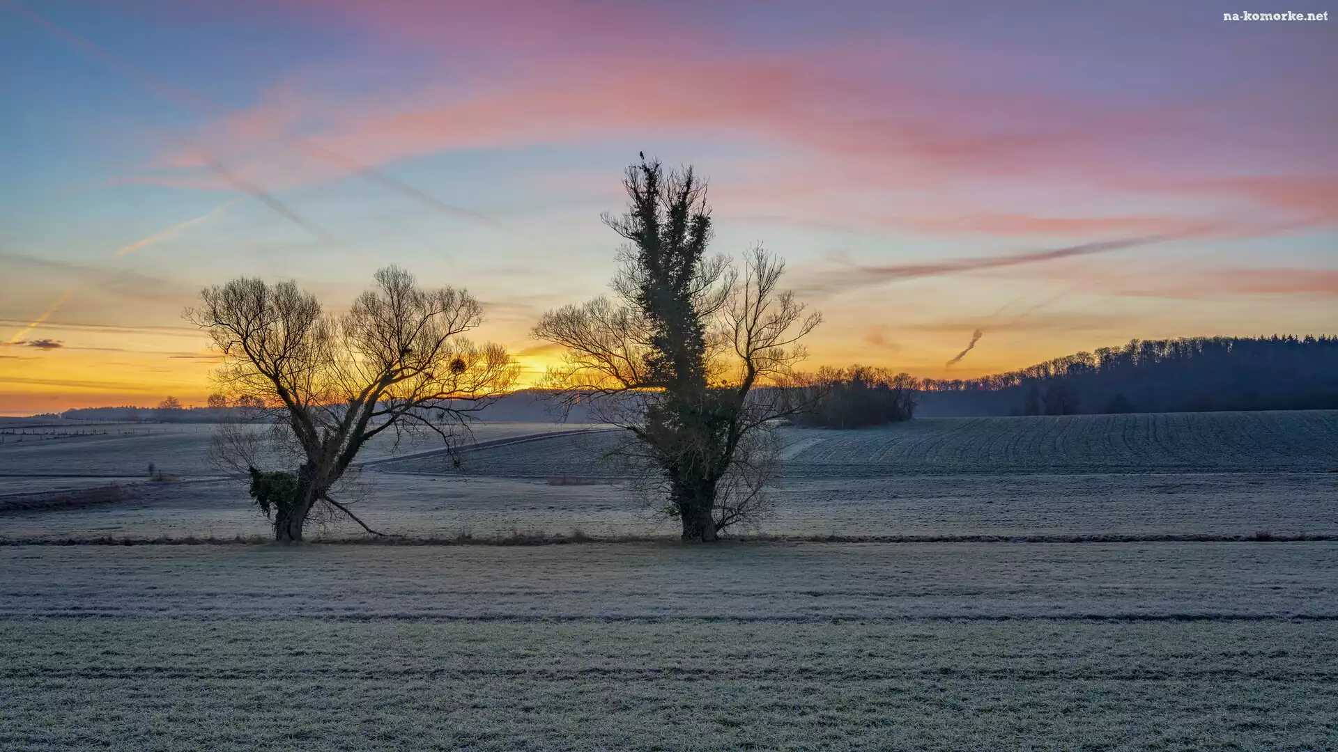 Drzewa, Pole, Szron, Wierzby, Wschód słońca na Komórkę