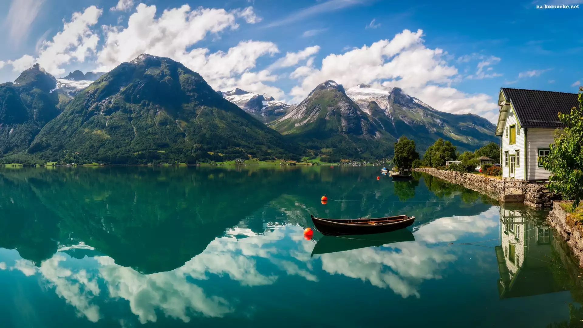 Wieś Hjelle, Norwegia, Domy, Jezioro Oppstrynsvatnet, Odbicie, Sogn og Fjordane, Chmury, Góry, Łódka na Komórkę |