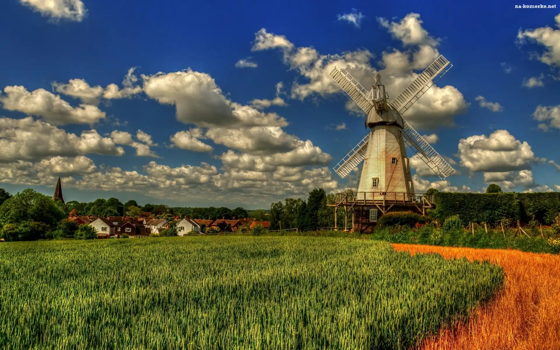 Wieś, Wiatrak, Pole, Niebo, Obłoki na Komórkę