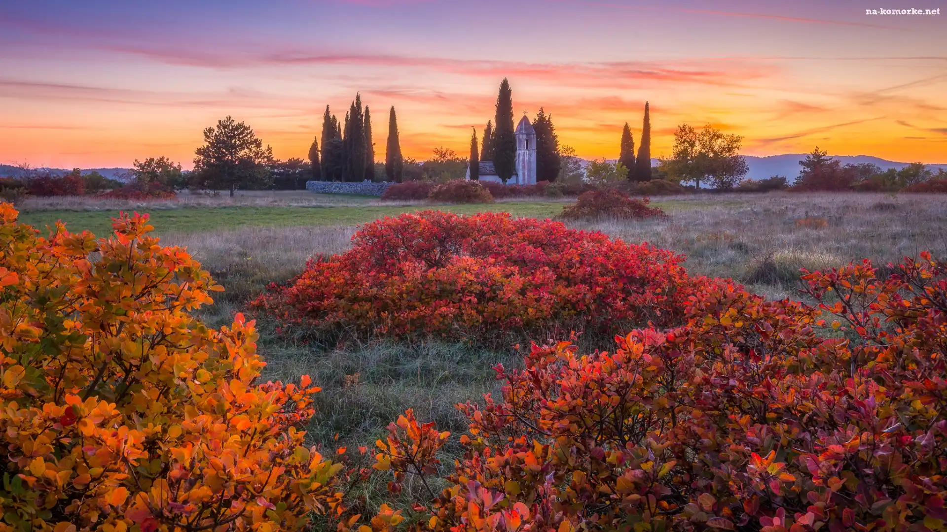 Słowenia, Krzewy, Kościół, Wschód słońca, Wieś Socerga, St Quiricus Church, Cyprysy, Kolorowe na Komórkę |