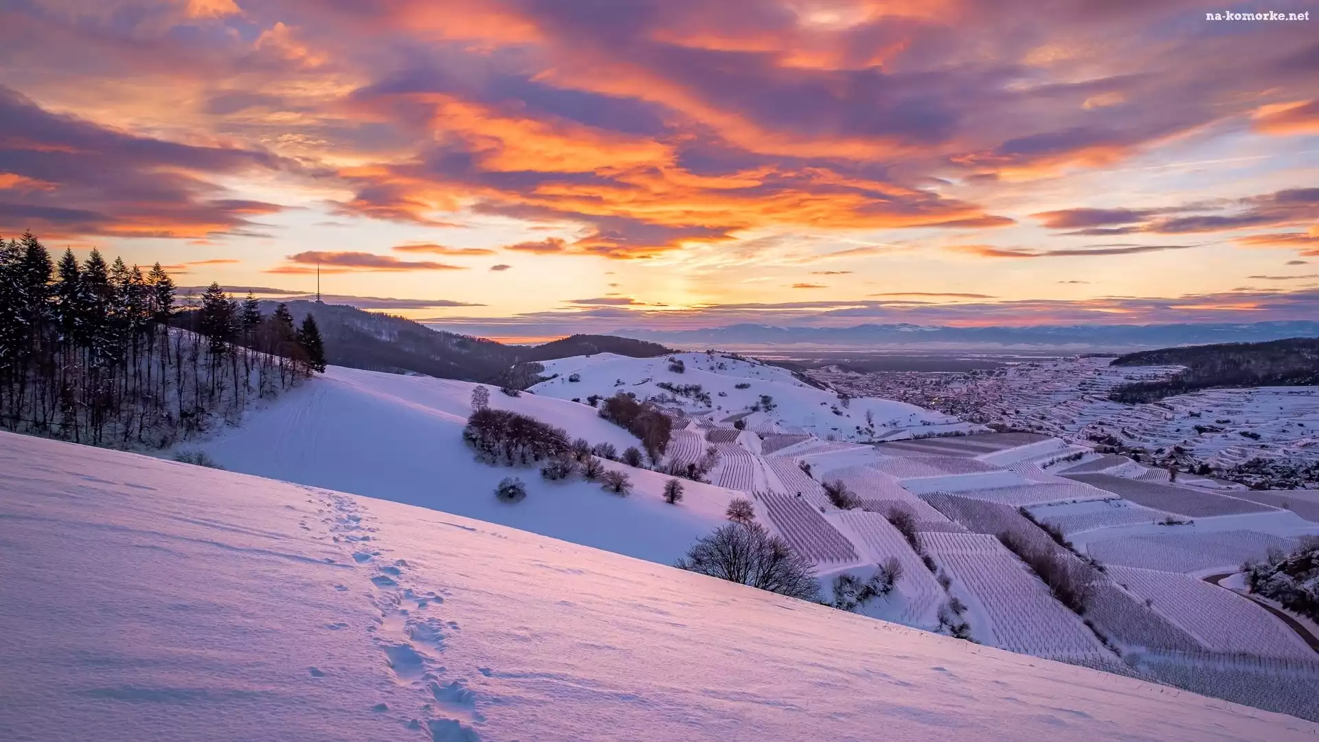 Kaiserstuhl, Zima, Winnice, Domy, Niemcy, Wzgórza, Badenia-Wirtembergia, Plantacja, Zachód słońca na Komórkę |