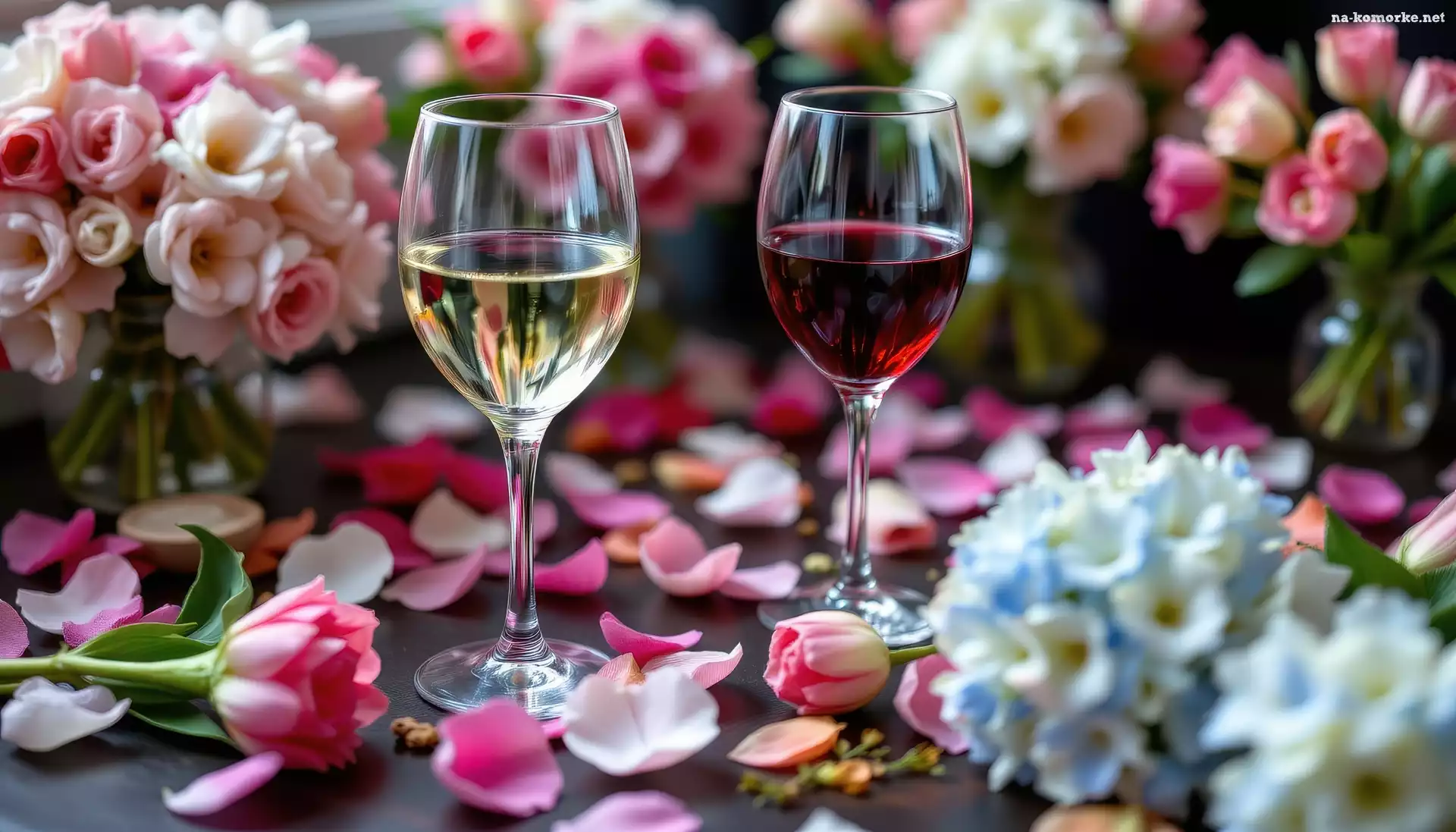 Dwa, Wino, Kwiaty, Kieliszki, Płatki na Komórkę