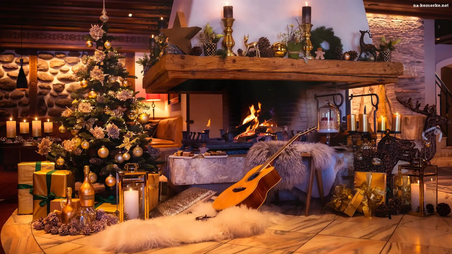 Salon, Prezenty, Wino, Choinka, Ozdoby, Gitara, Boże Narodzenie, Kominek, Świece, Lampion na Komórkę |