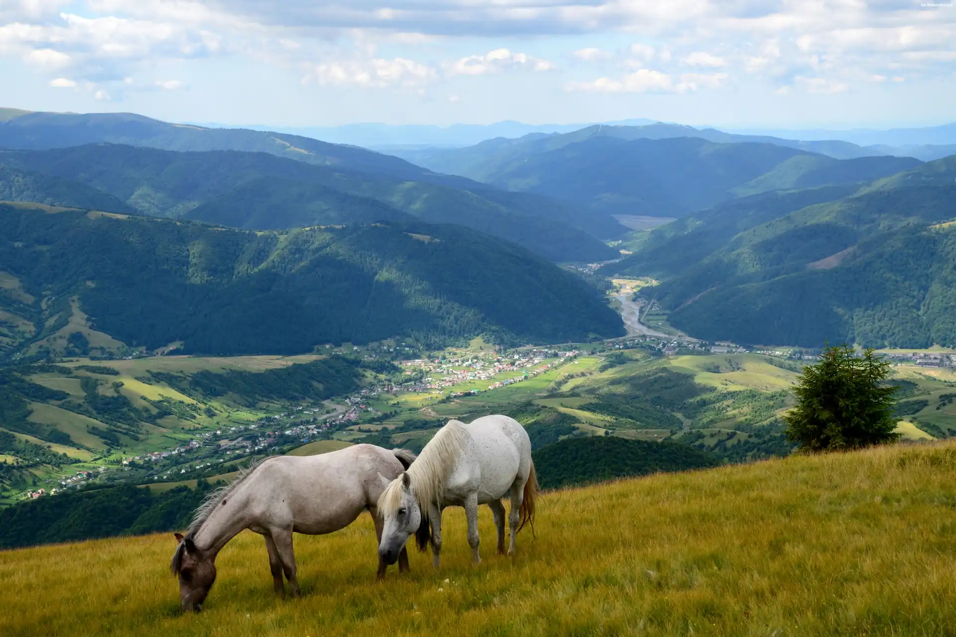 Łąka, Góry, Lasy, Pasące się, Konie, Dolina, Wioska na Komórkę