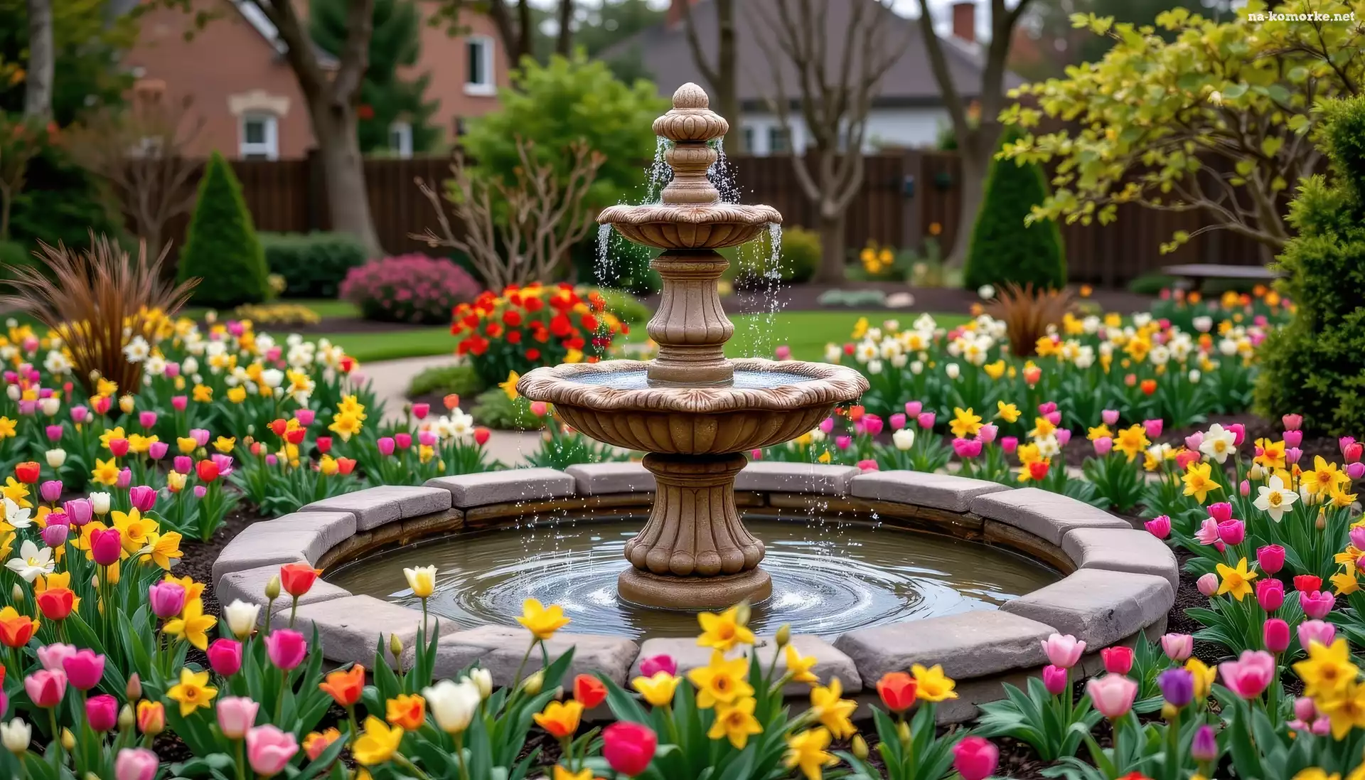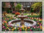 Wiosna, Drzewa, Kamienna, Żonkile, Fontanna, Park, Kwiaty, Tulipany, Kolorowe, AI na Komórkę