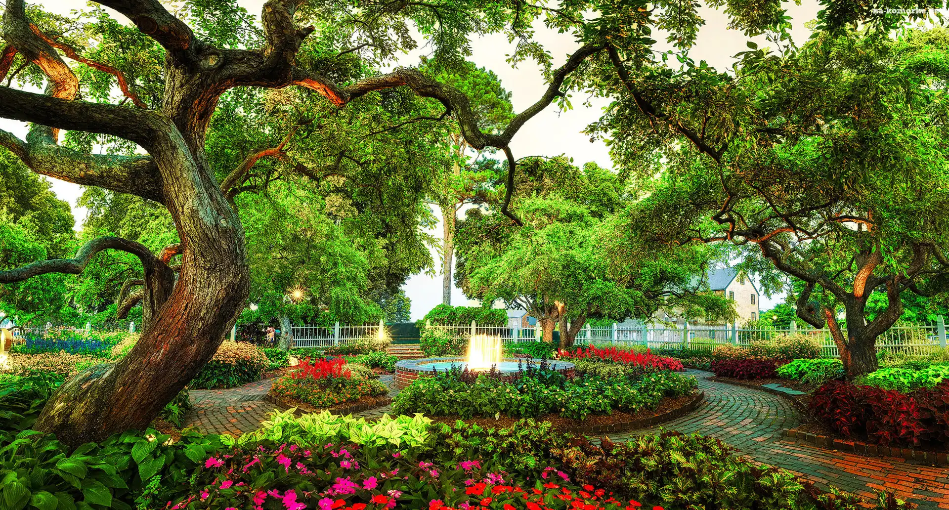 Wiosna, Park, Fontanna, Kwiaty, Stany Zjednoczone, Prescott Park, Stan New Hampshire, Drzewa, Portsmouth na Komórkę |