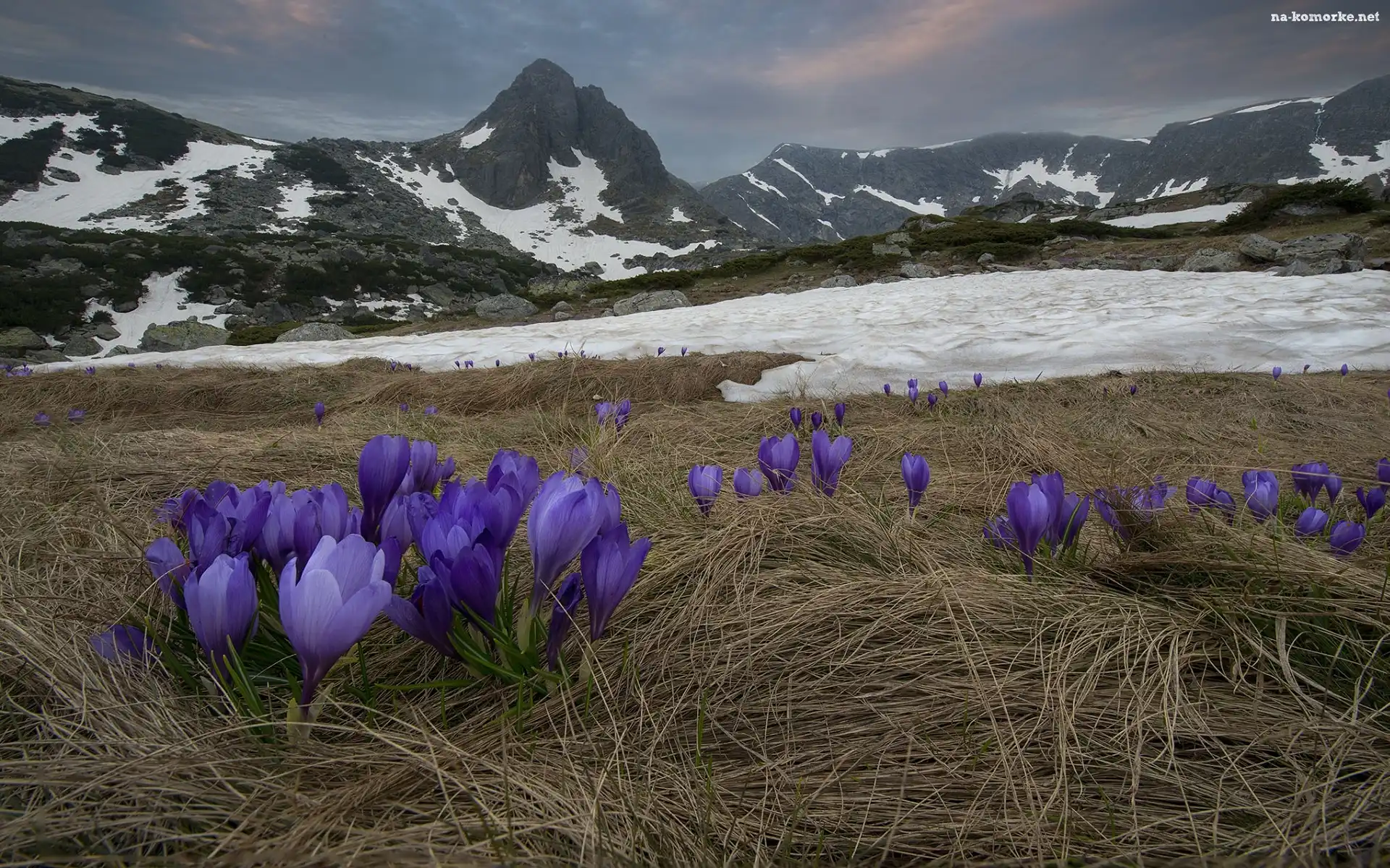 Bułgaria, Kwiaty, Góry, Krokusy, Masyw górski Riła, Ośnieżone, Szczyty, Wiosna na Komórkę