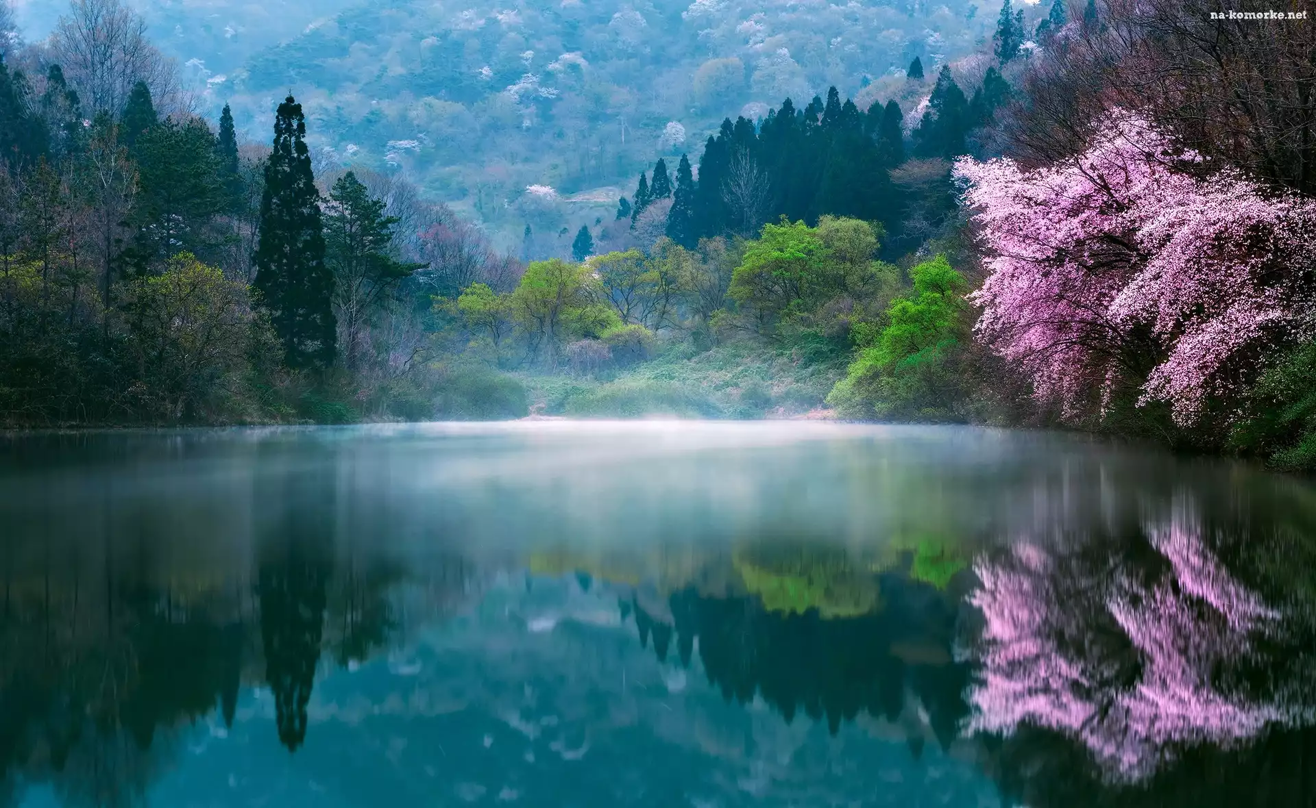 Poranek, Wiosna, Korea Południowa, Drzewa , Jezioro, Mgła na Komórkę