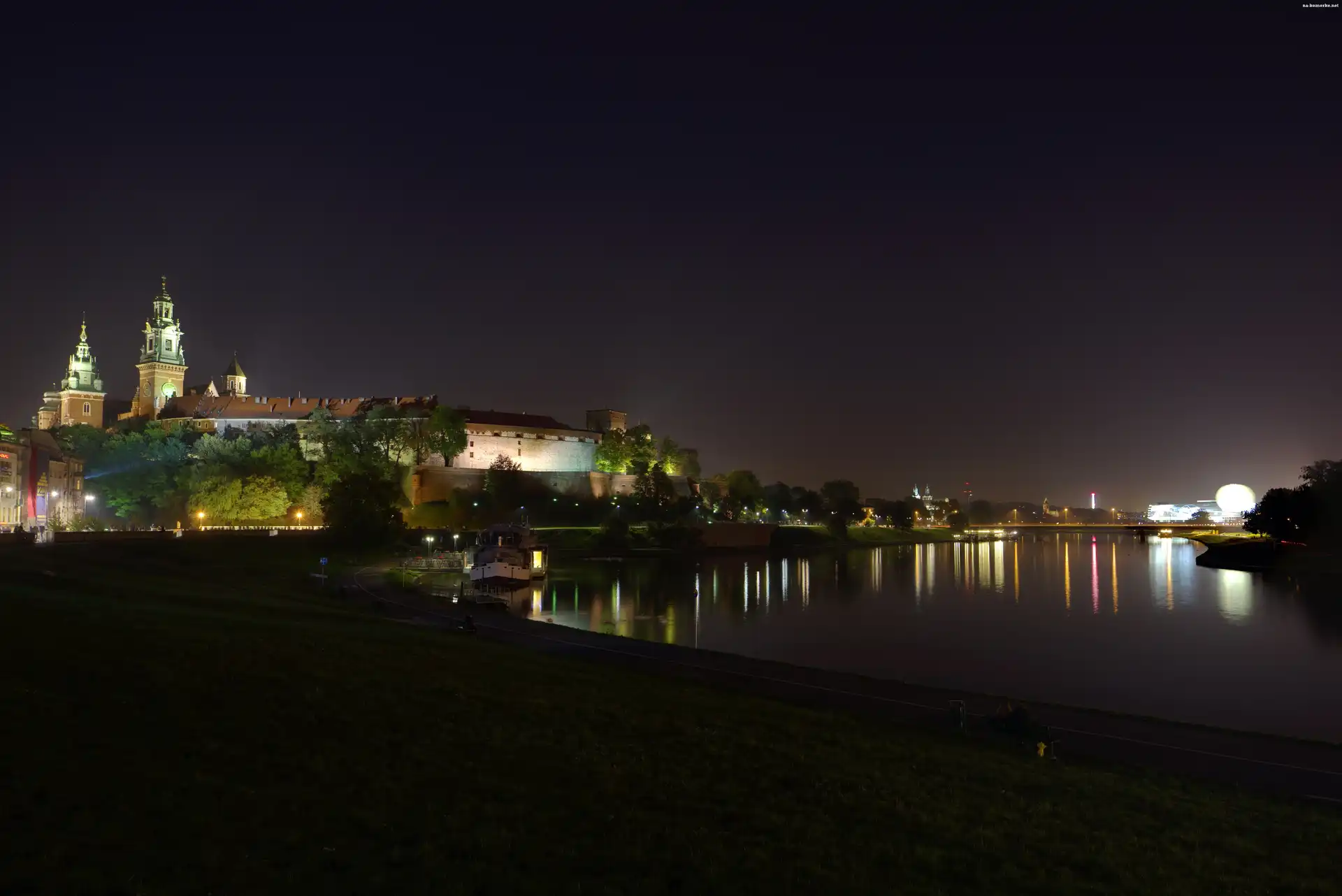 Wawel, Kraków, Polska, Noc, Zamek Królewski na Wawelu, Rzeka Wisła na Komórkę