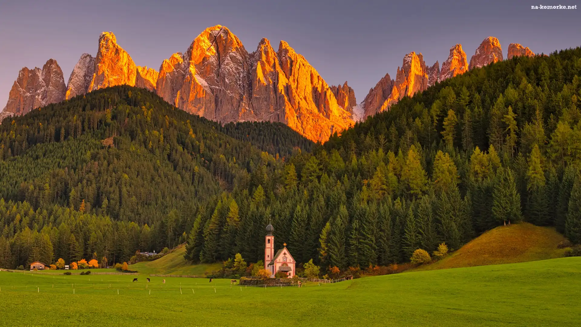 Włochy, Kościół św Jana, Dolomity, Południowy Tyrol, Łąka, Santa Maddalena, Las, Góry, Drzewa, Wieś, Dolina Val di Funes na Komórkę |