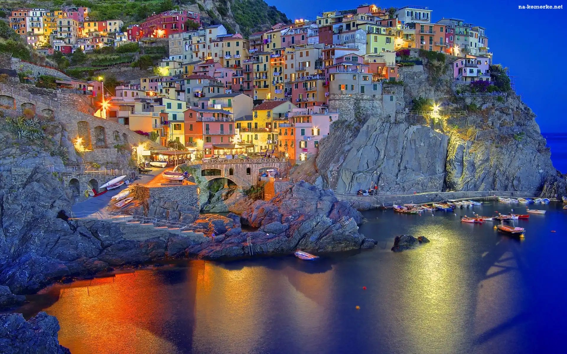 Wybrzeże, Włochy, Zmrok, Zatoka, Łodzie, Miasteczko, Manarola na Komórkę