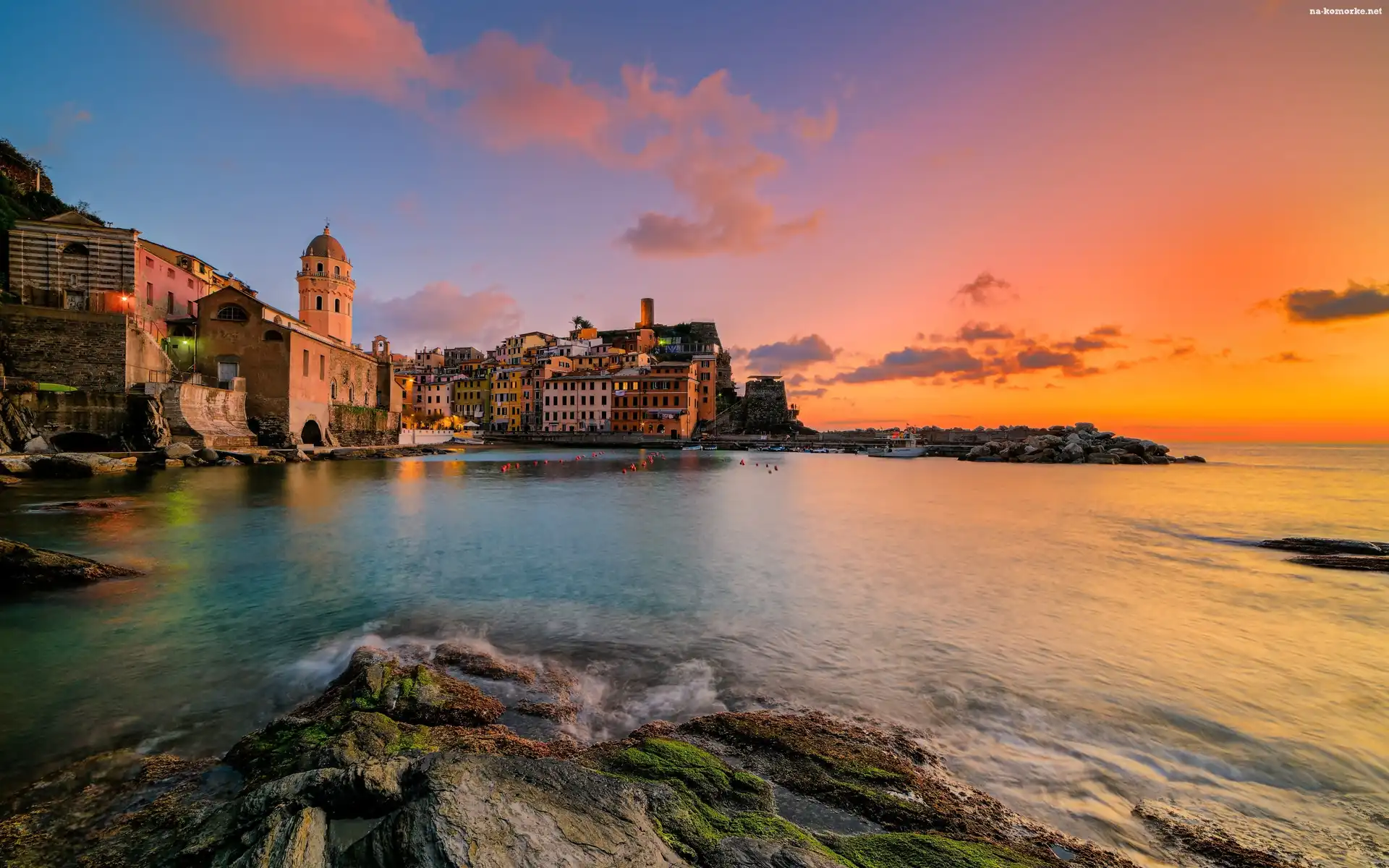 Włochy, Miasteczko, Vernazza, Domy, Zachód słońca na Komórkę